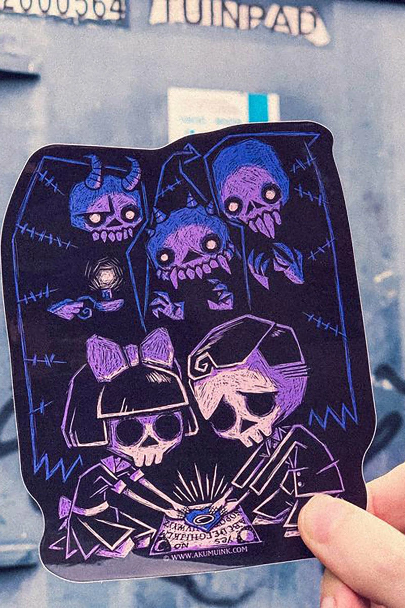 Creep out your computer, skateboard, guitar, whatevers with this killer sticker set! This spooky set includes 10 stickers designed by Akumu Ink. Check out the pics to see the epic stickers you’ll get! Each sticker is haunted with a glossy coating to protect against sun damage and water. Hell yeah!Â