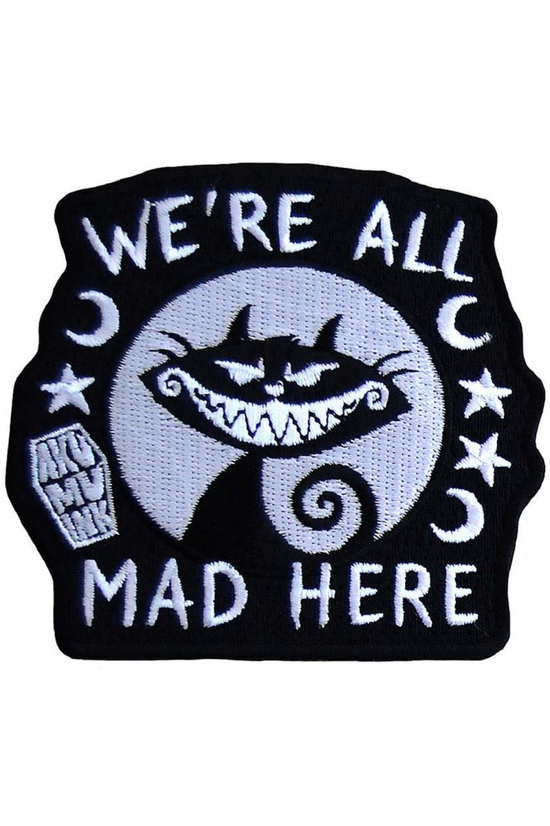 Fall down the rabbit hole with this creepy Cheshire Cat patch! Made of premium thread and high-quality embroidery, this wicked whimsy patch features crescent moons, stars, and the Cheshire Cat eerily grinning before a full moon. Finished with We’re All Mad Here lettering and Akumu Ink branding. Complete with iron-on backing for easy application!