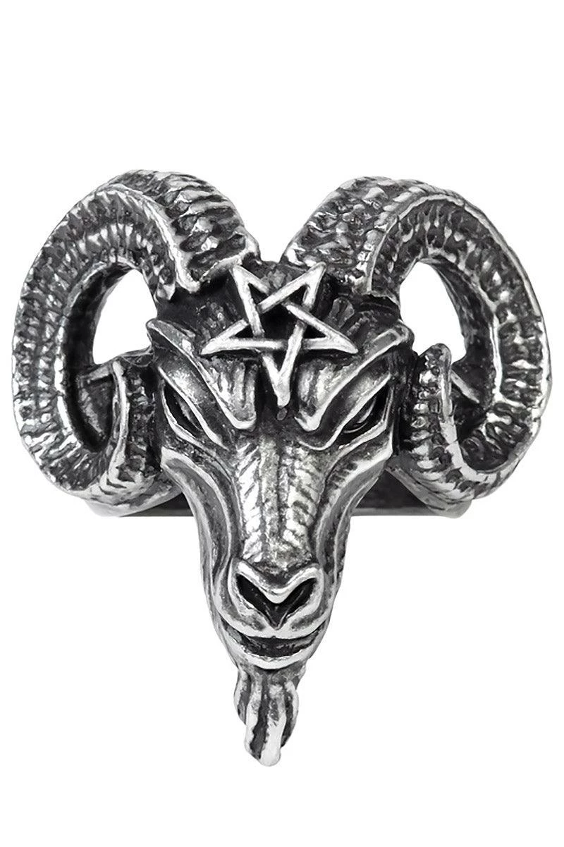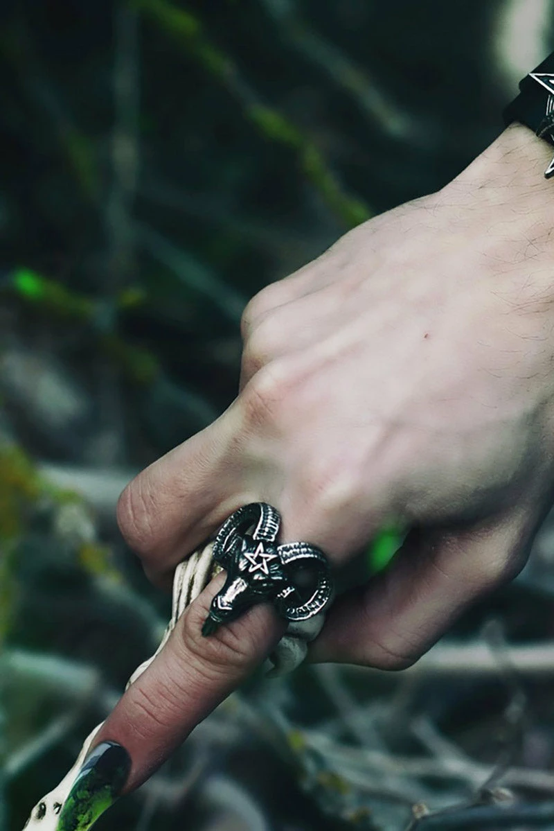 Summon blasphemous spirits from below with the wave of your finger, bewitched with this satanic ring. Constructed of premium pewter, this occult ring features the head of Baphomet with a pentagram engraved on his forehead. Select your size for the sinfully perfect fit.