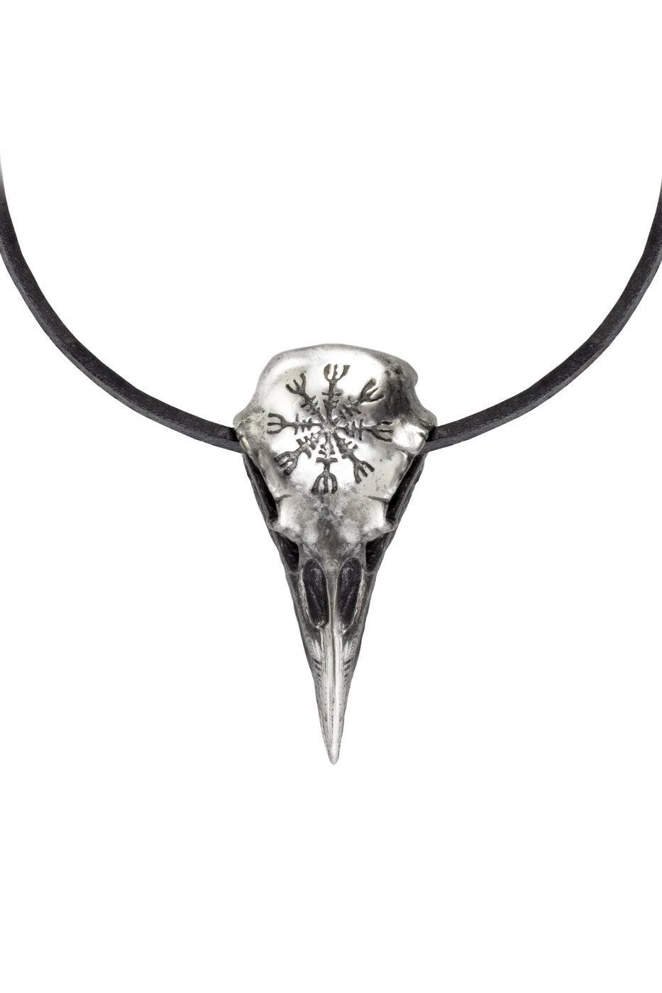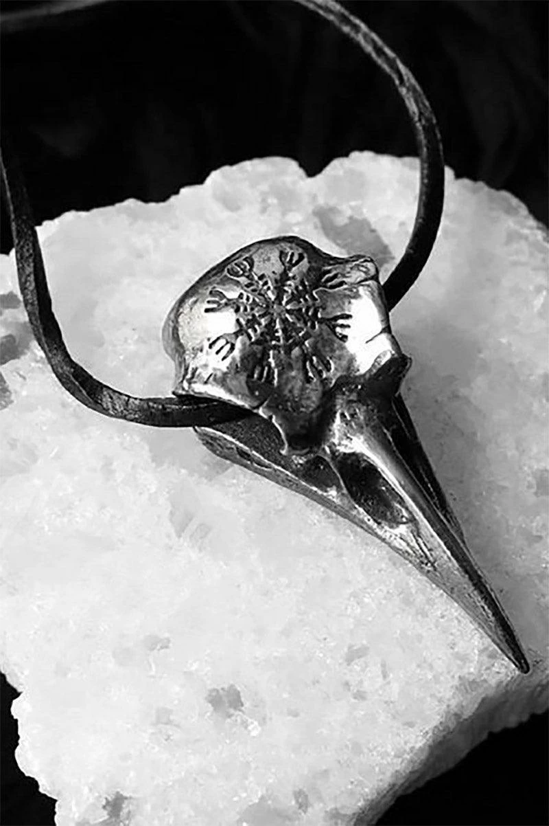 Evoke some Edgar Allan Poe to your style in this gorgeous gothic necklace. Sculpted to look like a realistic skull, the raven pendant features the engraved Icelandic stave symbol, Aegishjalmur (meaning the Helm of Awe). Let poetry flow from your fingertips, and summon ravens from the dreary skies, in this romantic raven necklace.