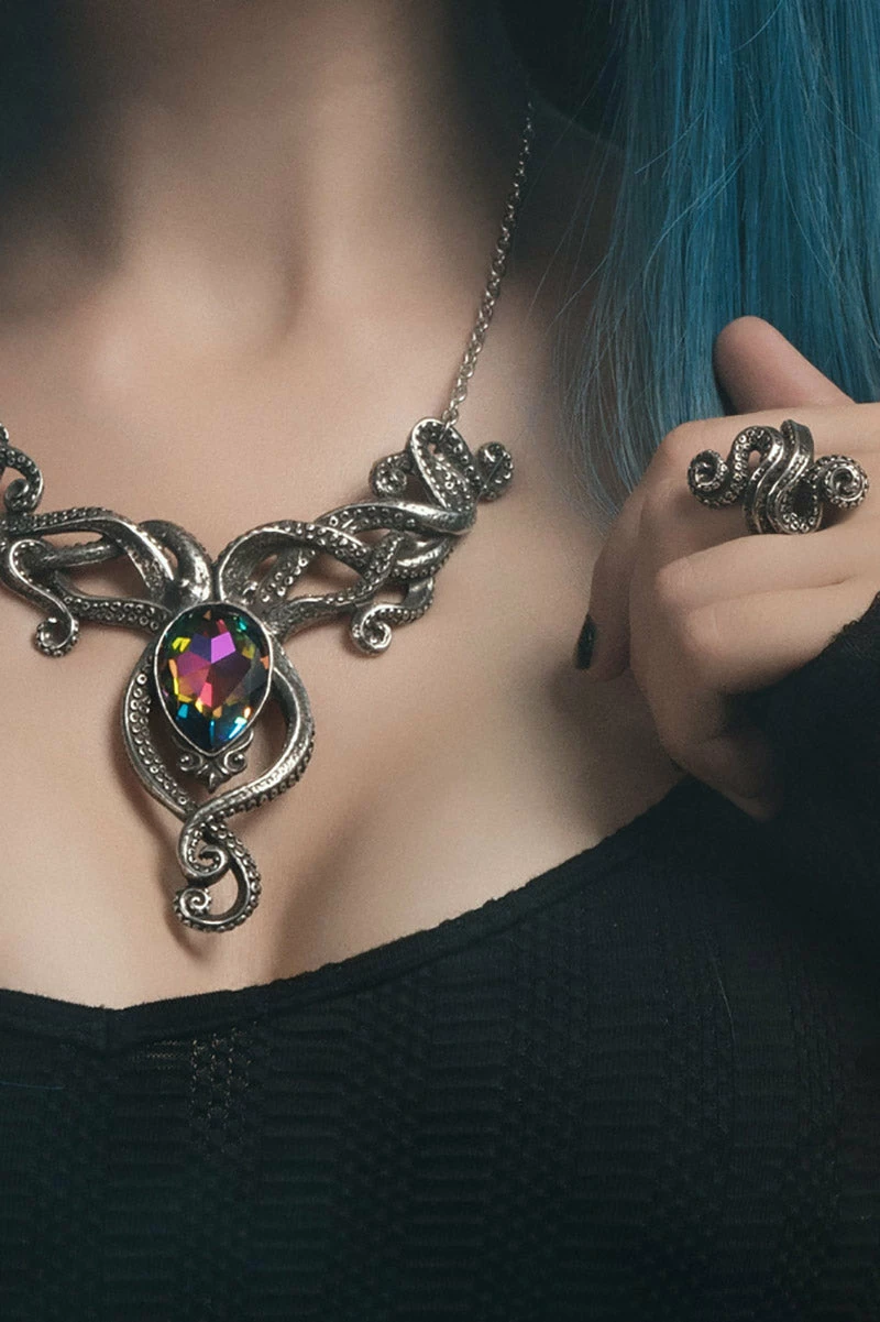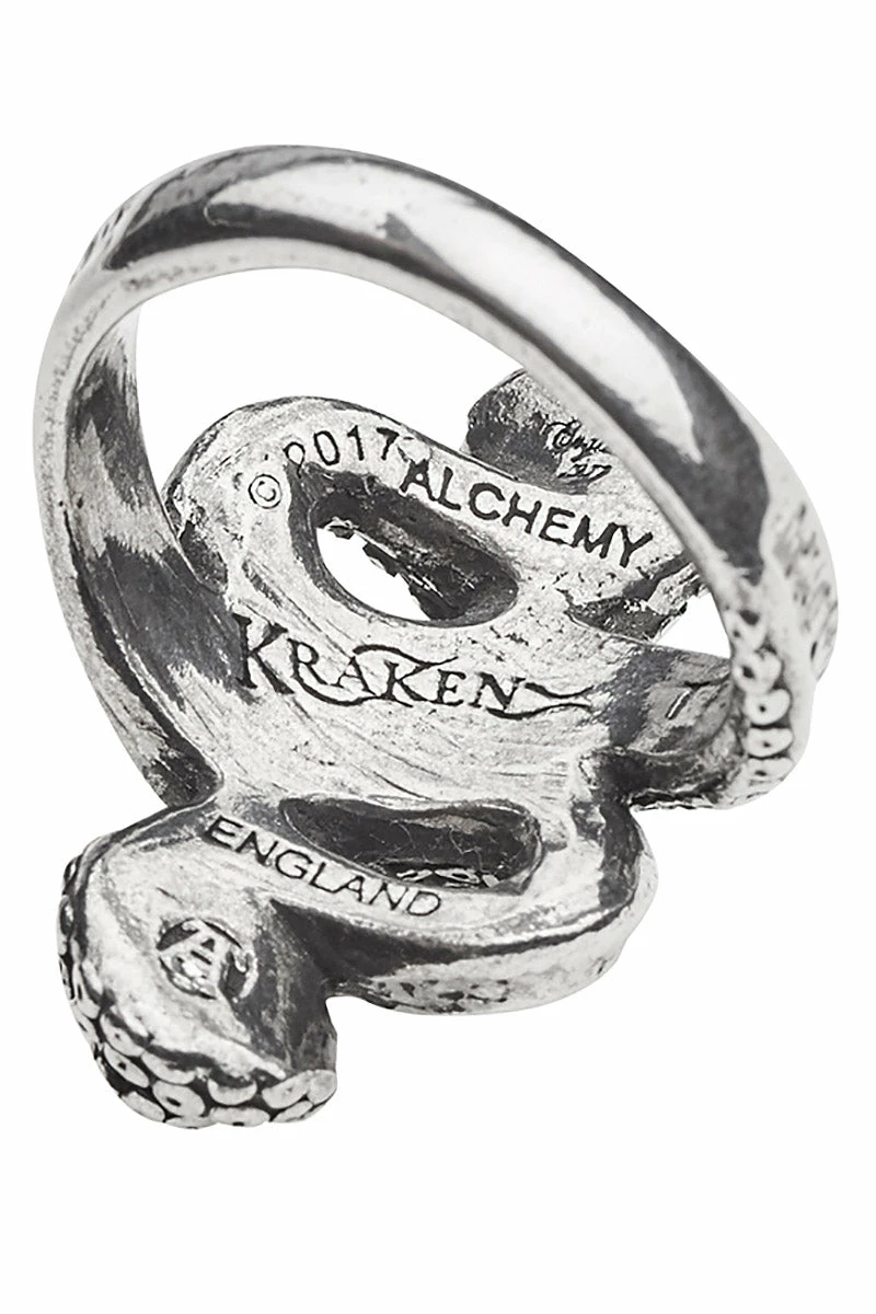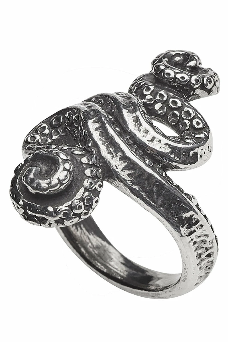 Invoke ancients of the deep with this gorgeous tentacle ring, inspired by the Kraken! Made of premium pewter, this steampunk ring features textured tentacles that wrap around the finger. Make dark waves in the aged wash and polished finish. Perfect for sea monsters and sirens.Â