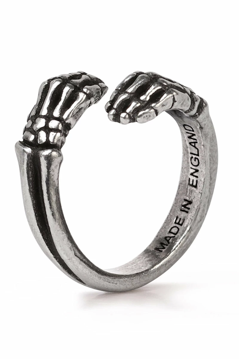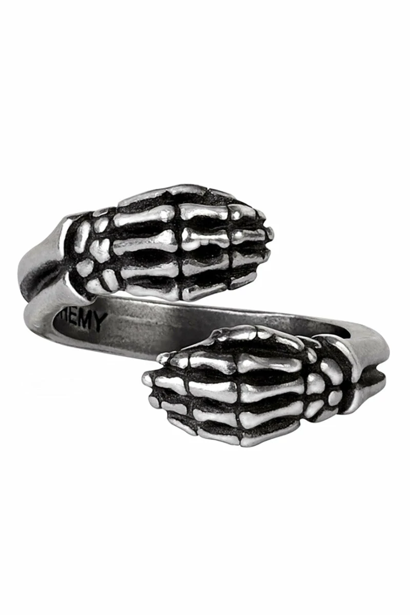 Wrap your finger in death’s embrace with this gothic skeletal ring! Constructed of premium pewter, this occult ring features a wrap-around design depicting two dead arms complete with articulated bone details. Wear this hand-crafted ring to conjure creeps to any outfit.