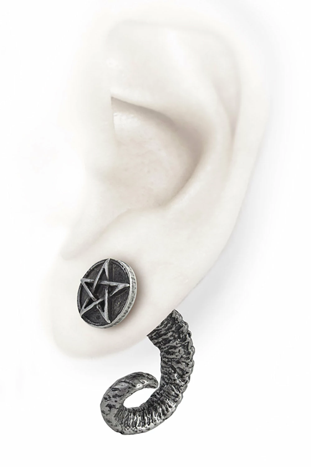 Keep the ghost of the ram close to your heathen heart with this haunting horn earring! Made of fine English pewter, this occult earring is made to look like a real gauge with a pentagram end cap and twisted horn back. Complete with surgical steel ear posts to protect your evil ear.Â