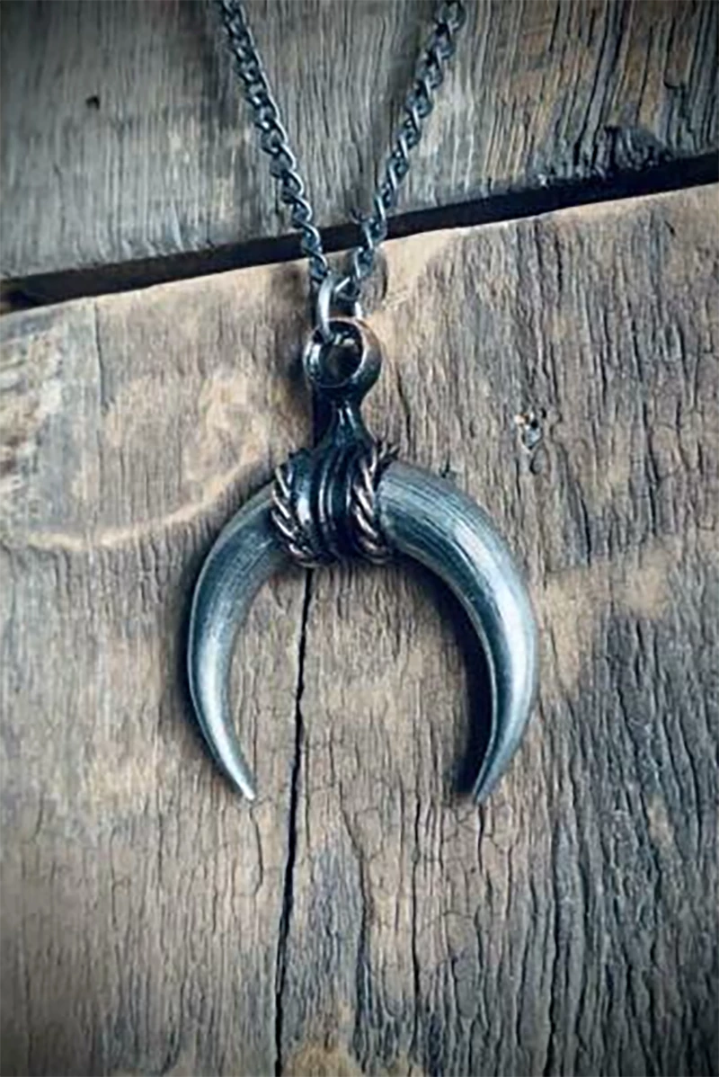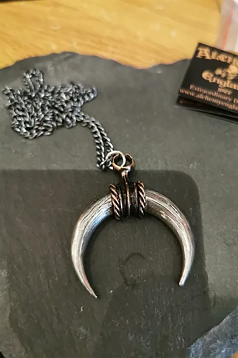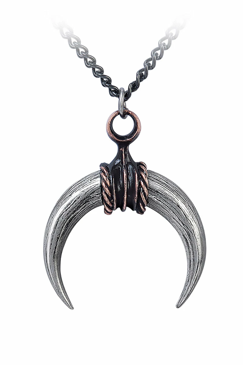 Pay homage to the ancient gods of old with this symbolic necklace, depicting the bull horns of the god Mithras. Shroud yourself in myth and mysticism in the premium pewter construct and hand-painted details. Washed in an aged finish to make this gothic necklace look like an antique!Â