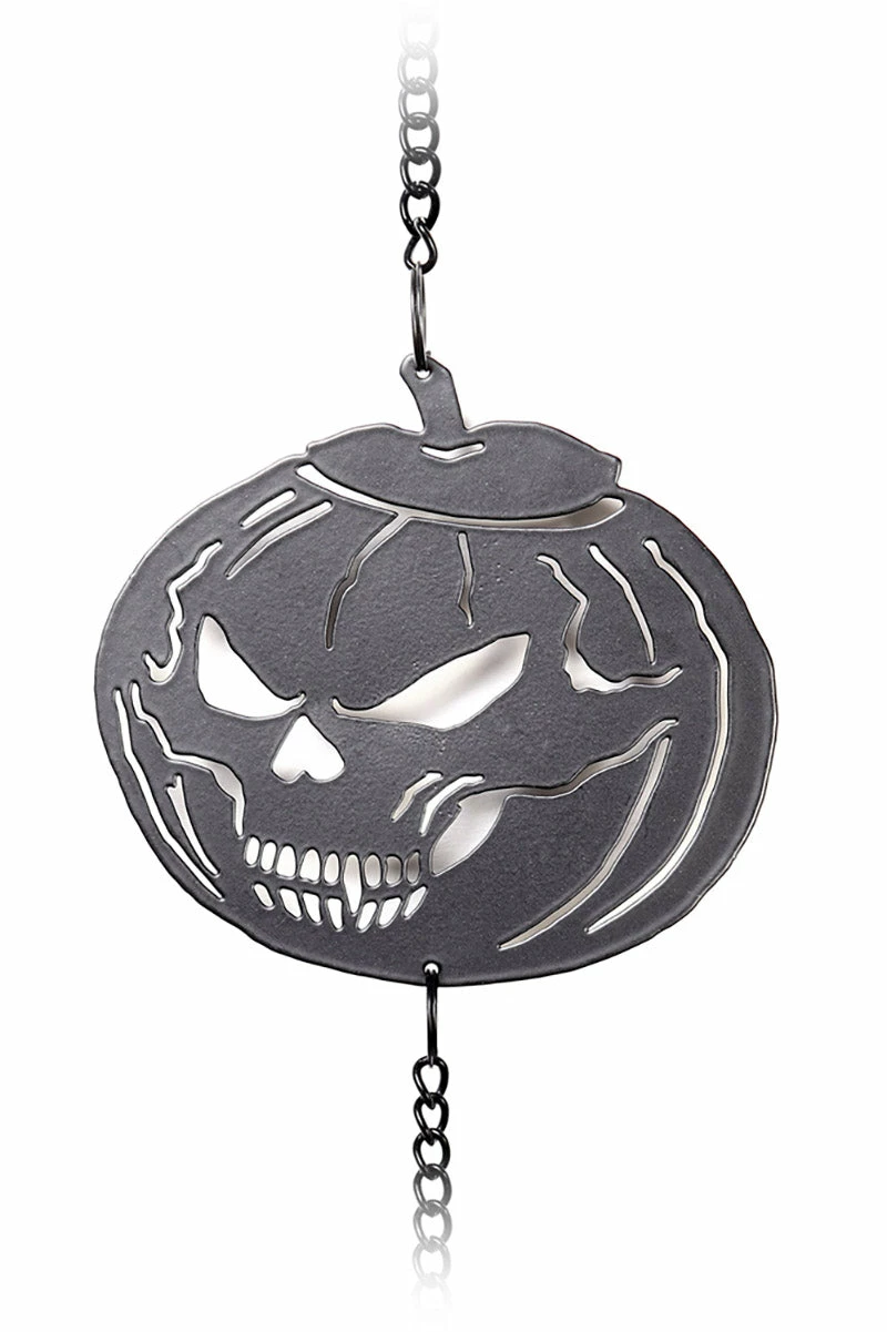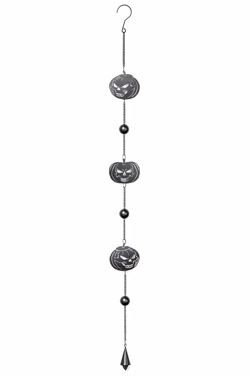 Treat your décor with this Halloweeny hanging decoration! Transform any room into a haunted pumpkin patch with the statement chain link design, hexed with large black beads, pumpkins carved with skull faces, and wind chime. Complete with an attached hook, this gothic decoration is ready to hang inside or outside. Perfect for gothing up your garden, or creeping out your crypt!Â
