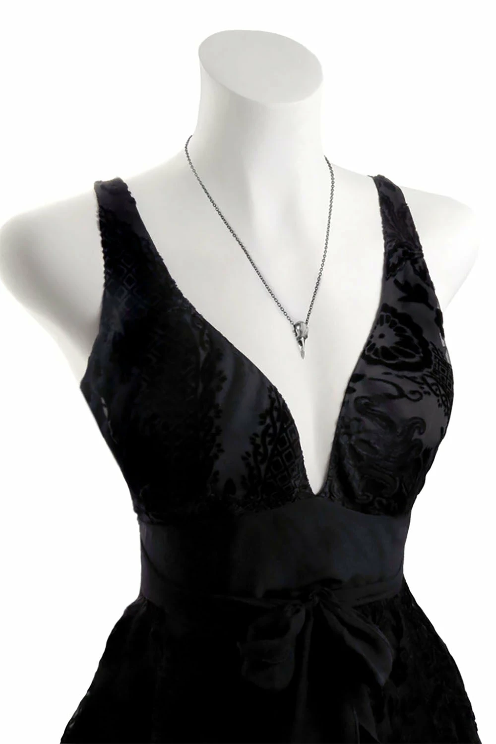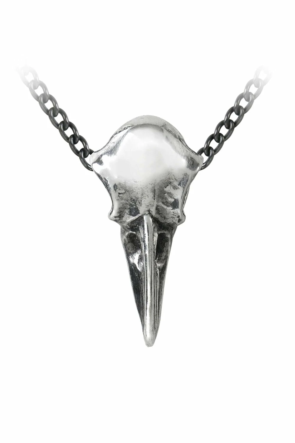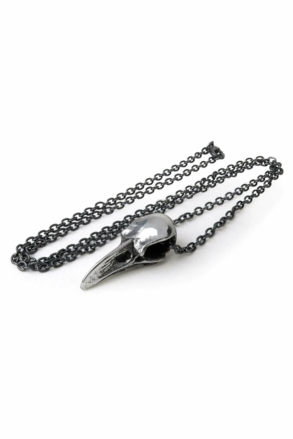 Let poetry flow from your fingertips, and summon crows from the dreary skies, with this gorgeous goth necklace! Constructed of fine English pewter, this romantic necklace is designed to look like a realistic crow skull. Pierced through the eyes with a black trace chain to keep it metal AF.