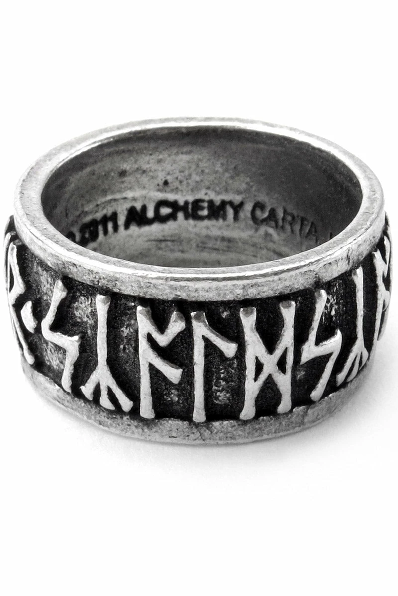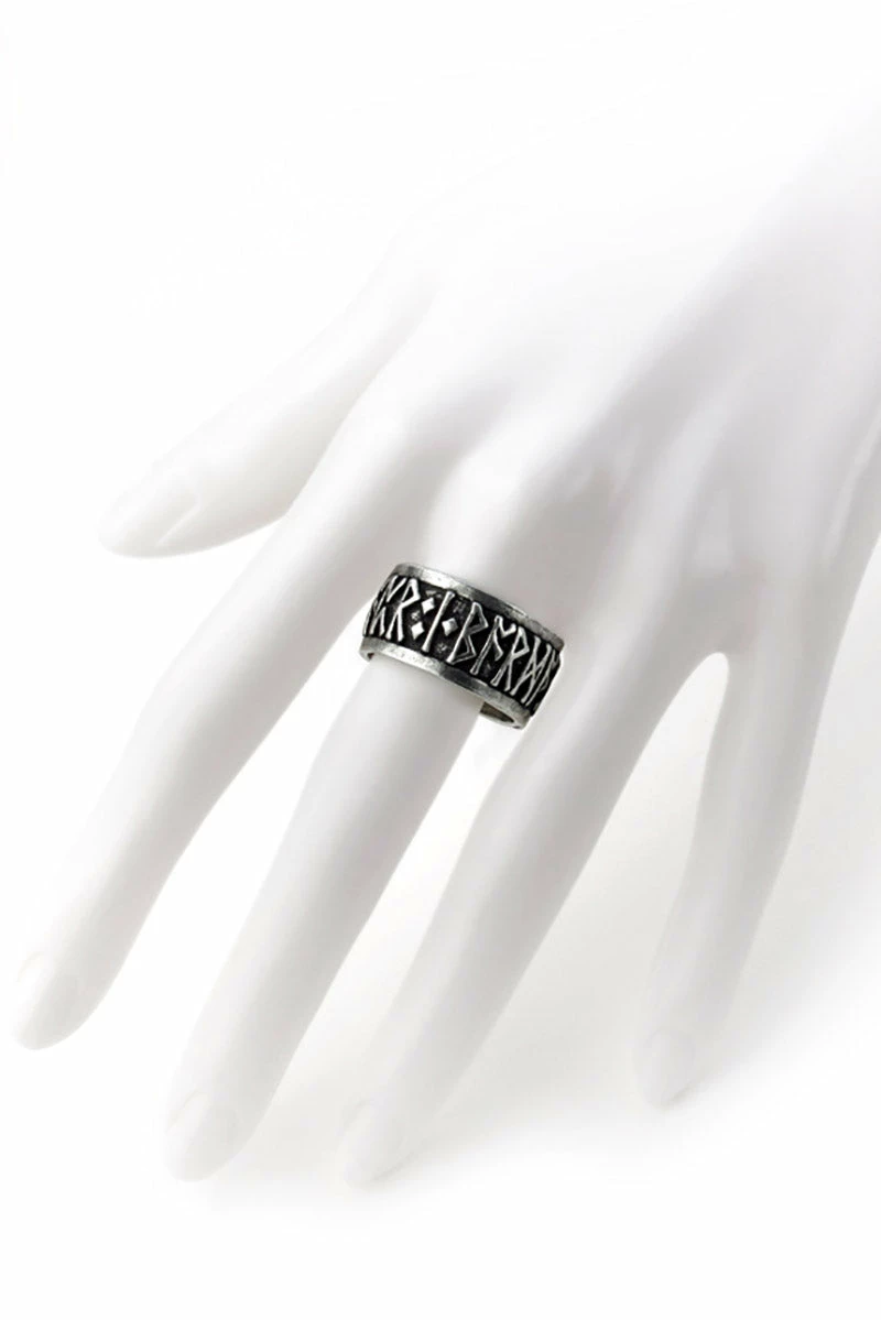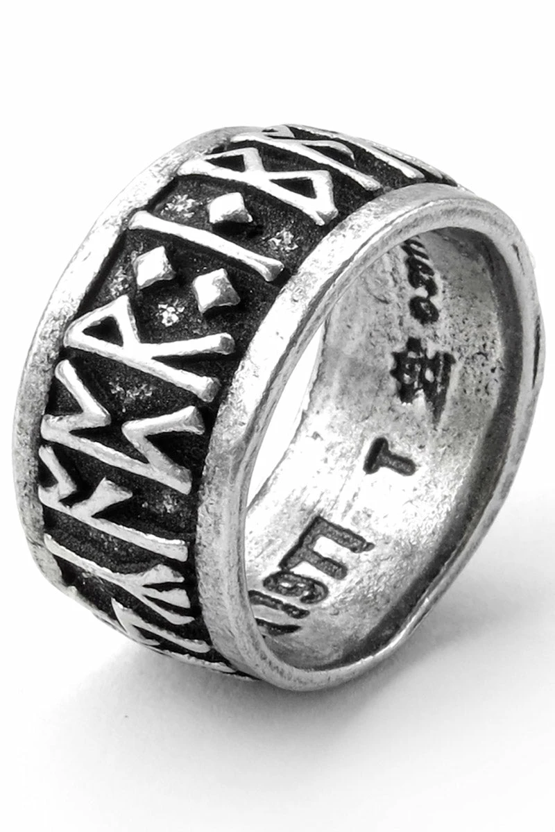 Invoke the gods of old with this gorgeous viking ring, constructed of premium pewter. Nordic runes are engraved across the band to recite the warrior mantra—poetry is in battle. Washed in an aged finish to make this ring like a relic of the Middle Ages.Â