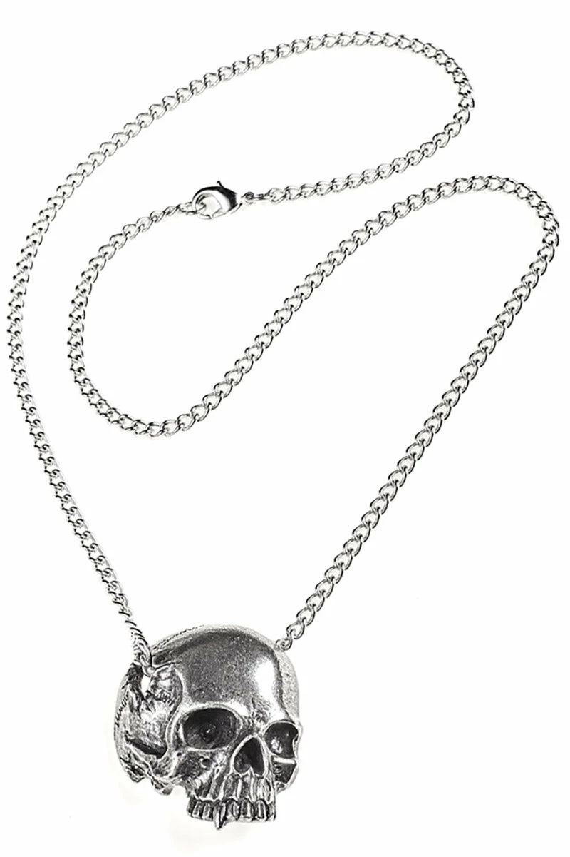 Bring death wherever you go with this vampiric skull necklace! Constructed of premium pewter, this gothic necklace features a realistic jawless skull with fissured details, vampire fangs, and soulless sockets. Pierced with a silver curb chain for conjuring creeps.Â