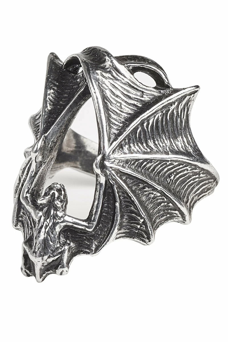 Summon creatures of the night with the wave of your finger, haunted by this beautiful bat ring! The bat hugs your finger with its outstretched wings, ready to take flight at your command. Washed in an aged finish to look like an antique!Â