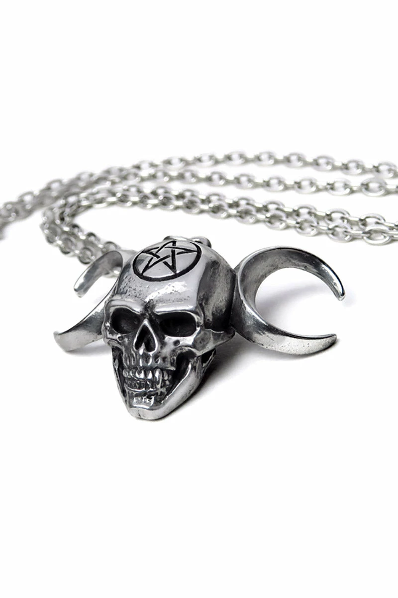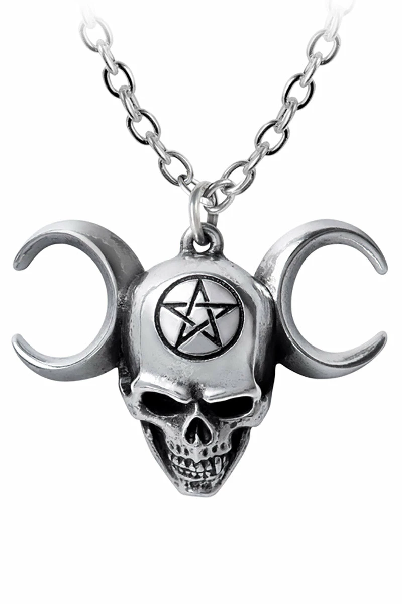 Let the powers of the dead protect you with this triple moon skull necklace! Constructed of premium pewter, this gothic necklace features a center skull engraved with a pentagram on its forehead. Two crescent moons haunt its sides for conjuring the occult.