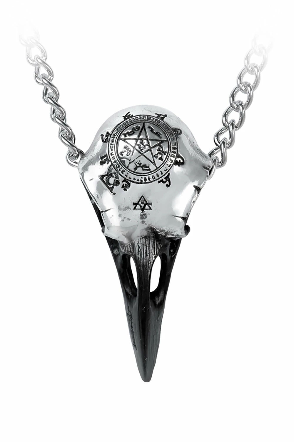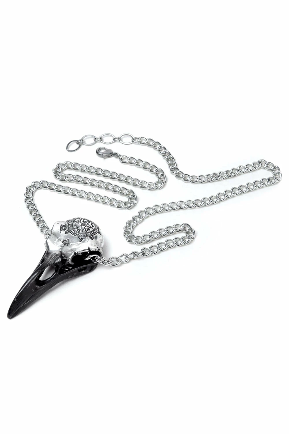 Invoke the gods of old with this Nordic necklace. Sculpted to look like a realistic raven skull, a Viking star with pagan patterns is engraved on the bird’s frontal bone. Pierced through the eyes with a silver chain to pay homage to the god of magic, battle, and death.