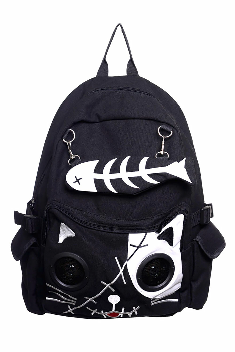 Keep your cat food and spell book in this dead kitty backpack, made for emo boils and ghouls unafraid to live loud! With a speaker system built into the creepy cat eyes, this skeleton backpack is constructed to play your fav tunes off any Mp3/Mp4 device! With loads of space + pockets, this emo backpack’s got plenty of room for cartin’ all your spooky stuffs.