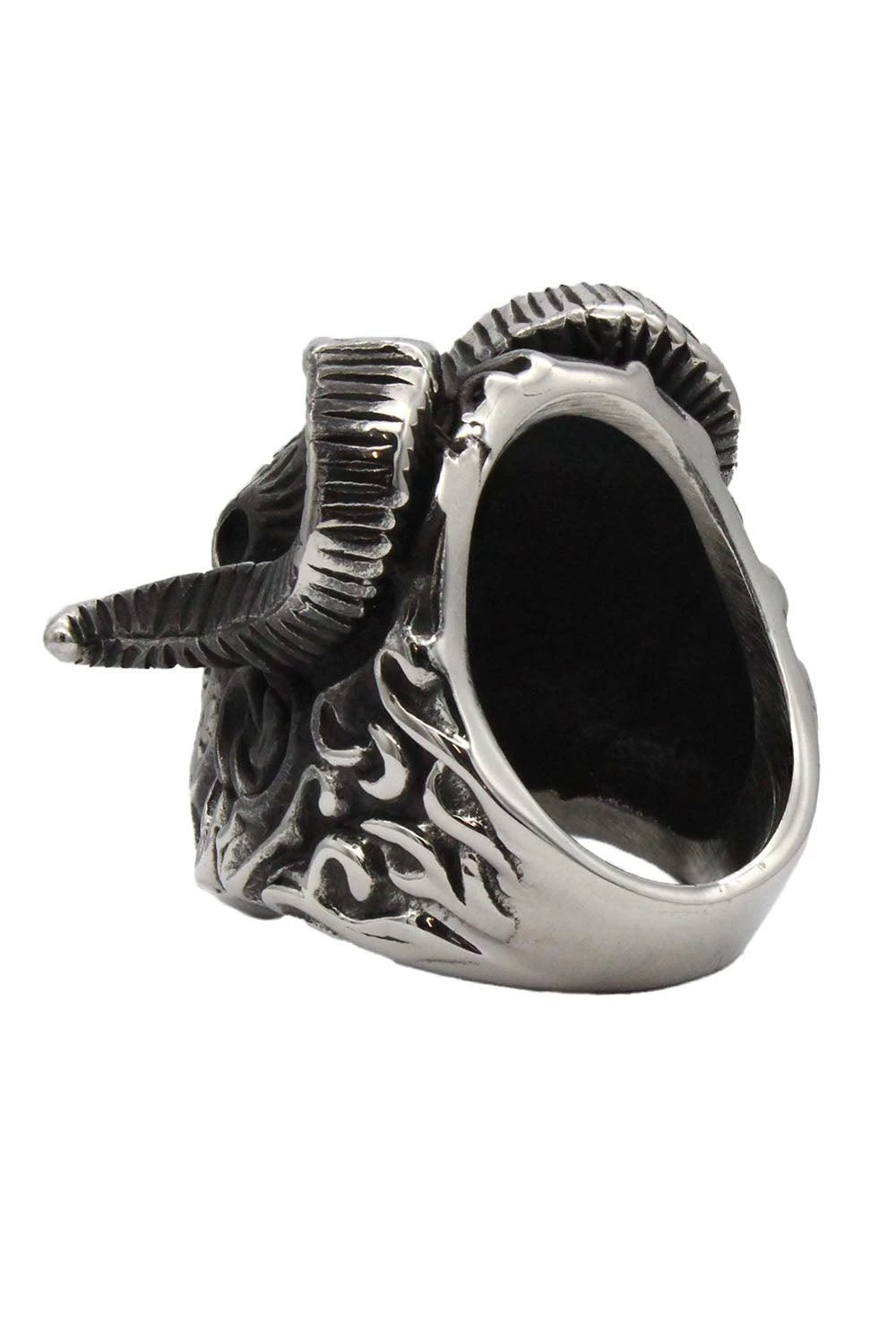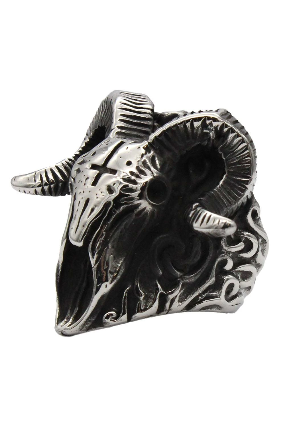 Summon blasphemous spirits from below with the wave of your finger, bewitched with this satanic ring. Constructed of stainless steel, this occult ring features the skull of Baphomet, with an inverted cross engraved on his forehead. Select your size for the sinfully perfect fit.