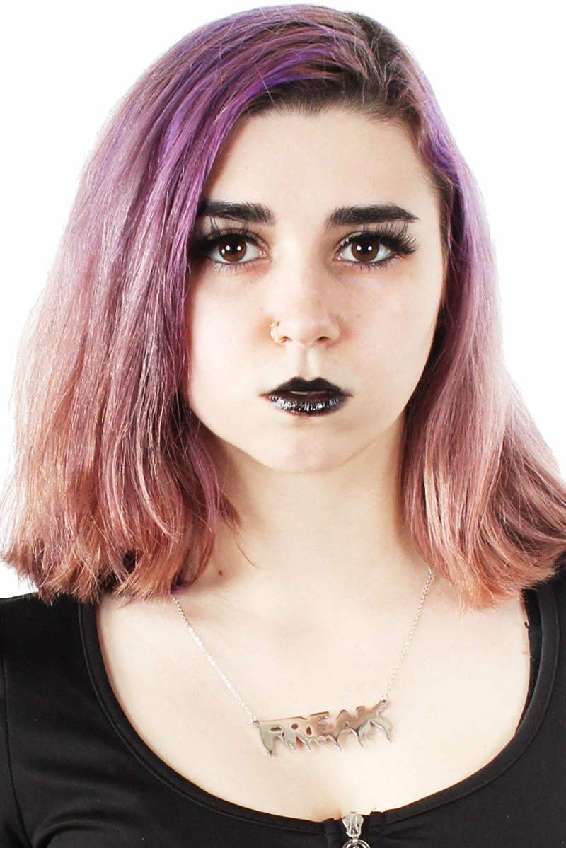 A freak in the streets, a freak in the sheets! Own your own weird wayz in this ooky spooky necklace. Constructed of shiny stainless steel, this goth necklace spells FREAK in ooey gooey font. The perfect necklace for freaks and fiends!Â
