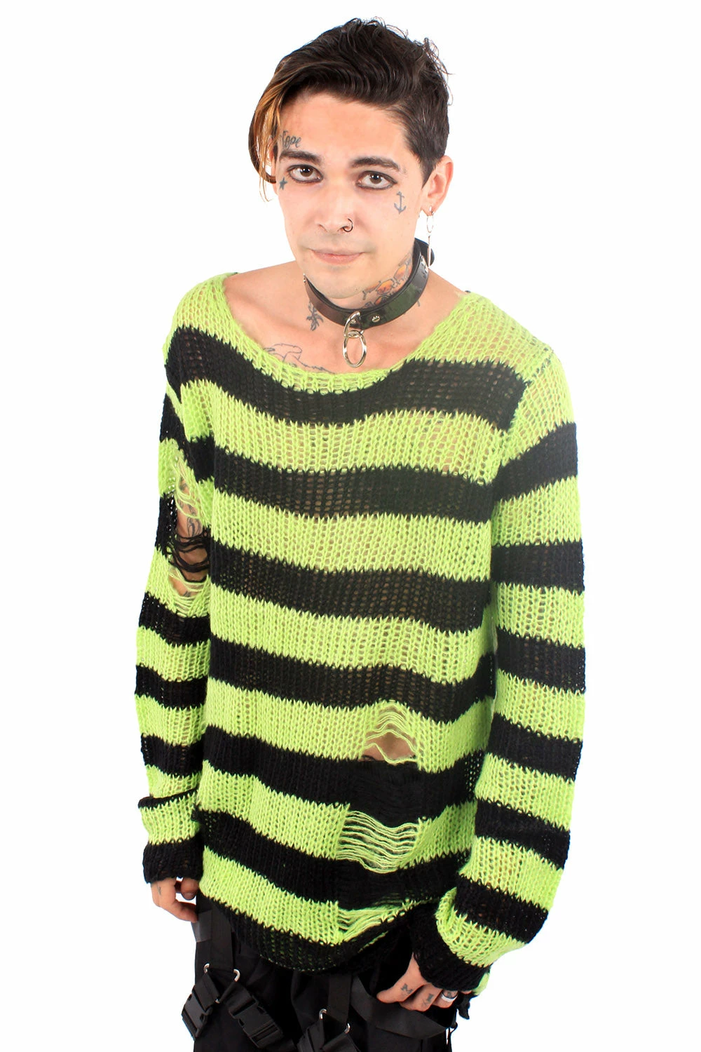 Commit lime crime in this sikk striped sweater! Be the highlight of their night in the contrasting green and black stripes, complete with distressed details and cozy knit construct. Wrap up in the exxtra long sleeves + length for exxtra drama.Â