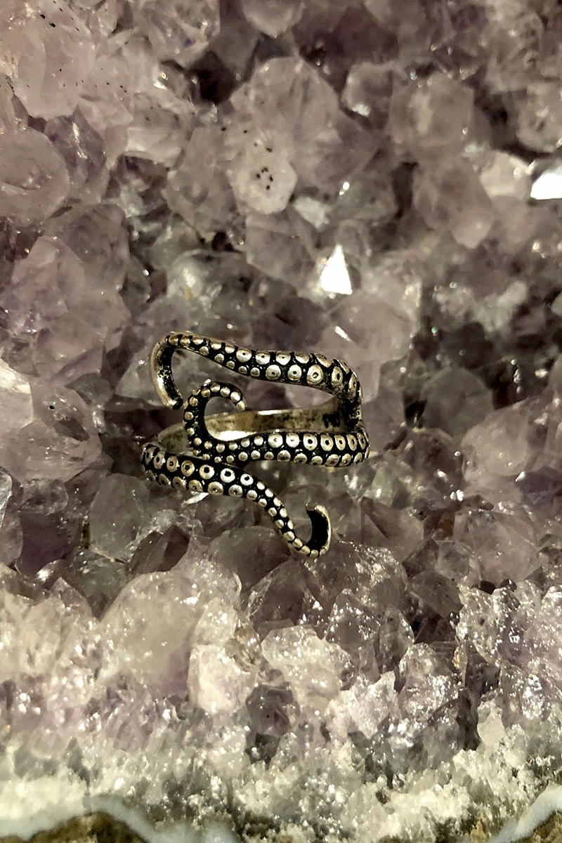 Invoke ancients of the deep with the Tentacle Ring! Made of high-quality metal, this statement steampunk ring conjures monsters of the deep with its swirled structure and textured tentacles. Simply pinch the tentacles together to fit any finger. Make dark waves in the aged finish.
