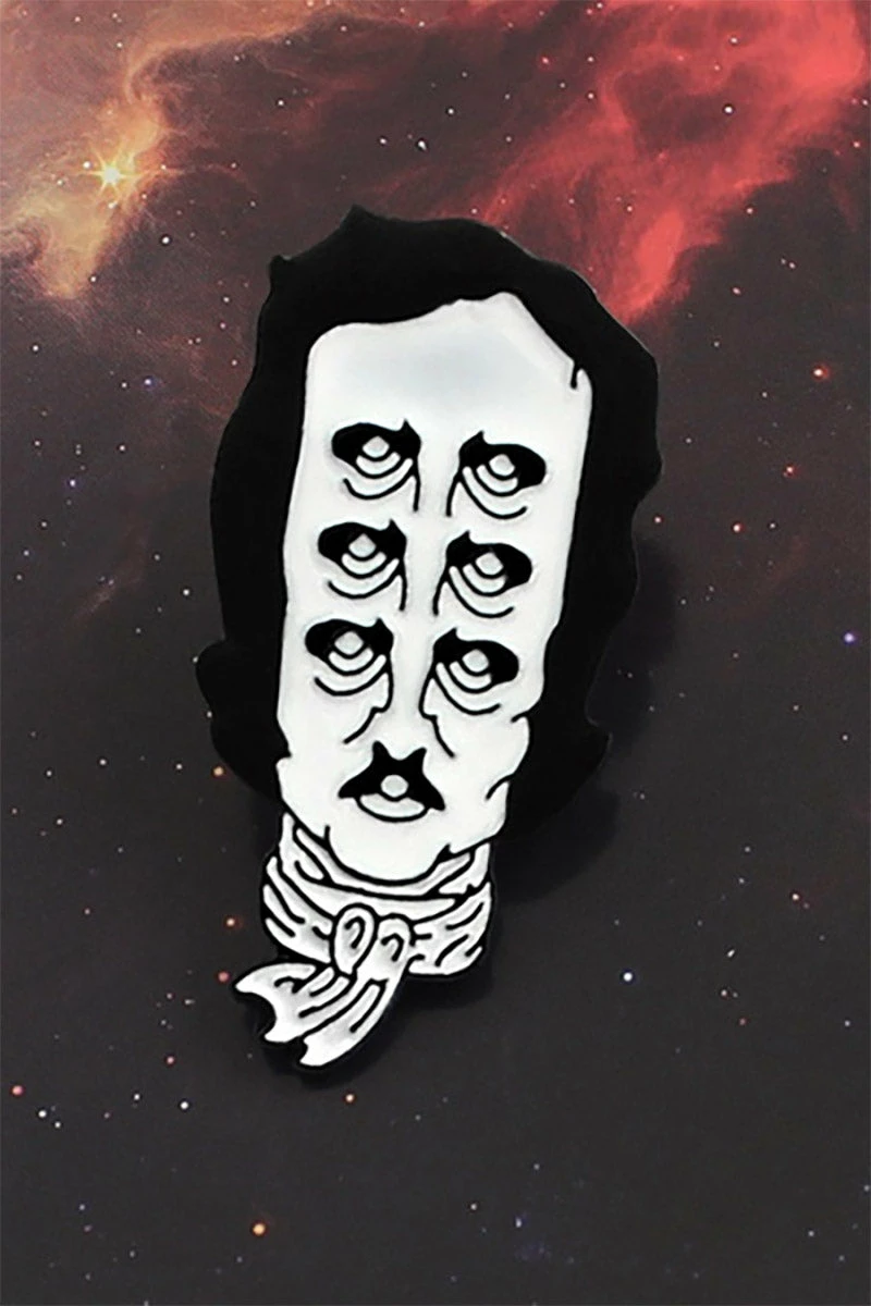 Call upon the ghost of poets past with this occult Edgar Allan Poe pin! Painstakingly engraved, this enamel brooch features the disembodied head of Edgar Allan Poe, possessed with six eyes! Finished with a button back closure, perfect for pinning to your jacket, backpack, purse, or anything your dead heart desires.Â