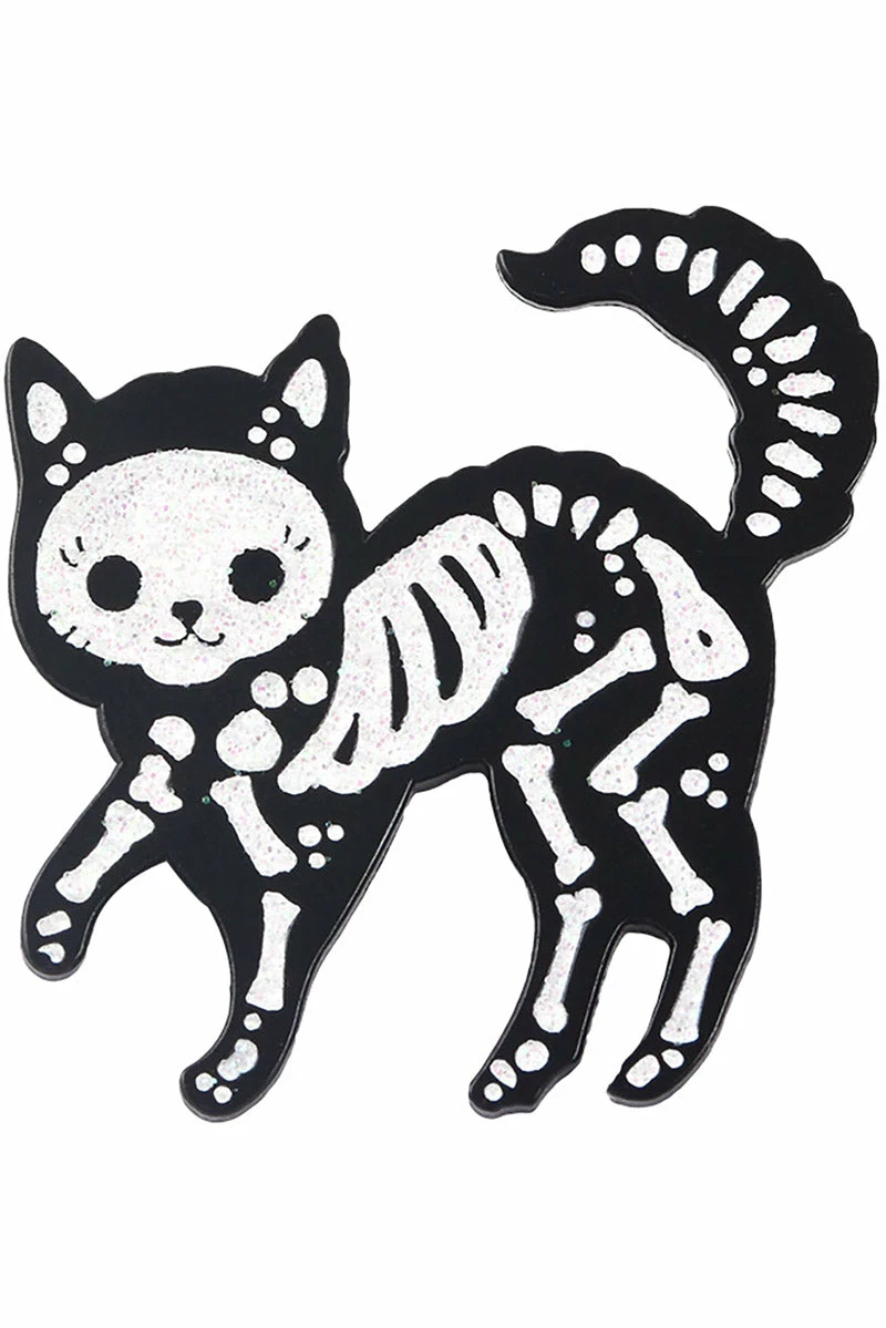 Keep your kitty with you always with this darling dead cat pin! Expertly engraved, this gothic badge features a ghostly-white skeleton cat haunted all-over with glitter details! Made of metal enamel and secured with a button backing for a spooky-strong hold.