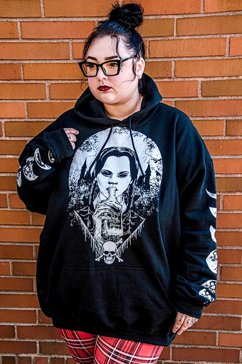 Embrace your inner Addams in this wicked Wednesday hoodie! Sipping on a bottle o’ poison, Wednesday lurks outside her haunted house concealed by the fog of a full moon. A skull and crossbones finish her chilling cameo, with beastly back eyes and a demonic taloned hand. Complete with distressed moon phases down the long sleeves!