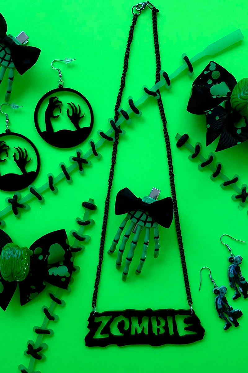 Zombify your look with this drop-dead-gorgeous necklace, featuring the word ZOMBIE in ooky spooky font. Bring death wherever you go in this horror necklace, designed to break hearts and blow brraaiinnss. Be sure to remove the protective sticker before wearing to reveal the zombie charm in all its goth glory!Â