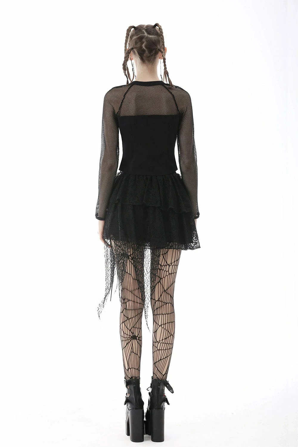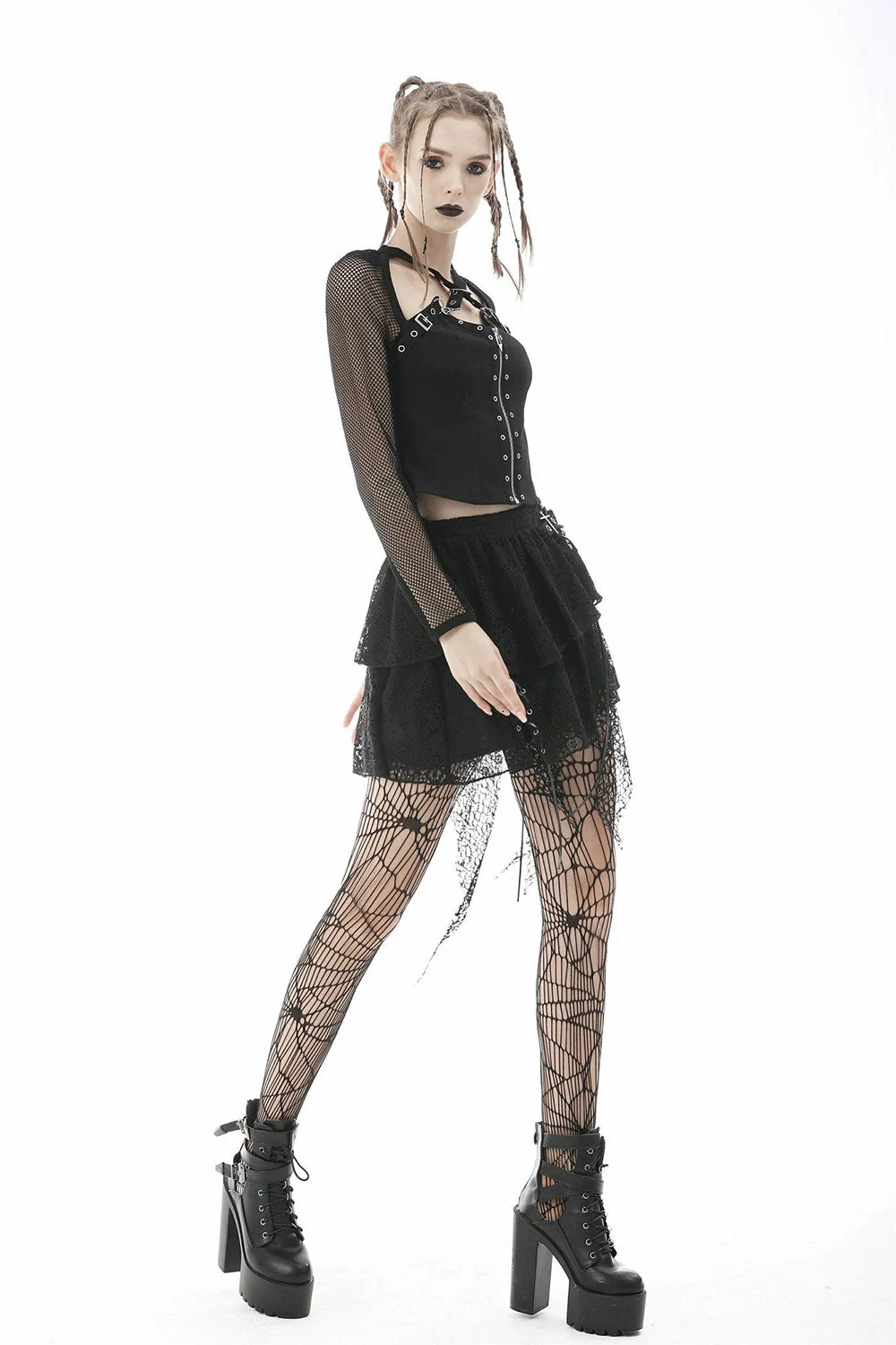 Harness your inner chaos in this stunning punk fishnet top! Gain the upper edge in the fierce fit, hollow-out detailing, and o-ring harness. Features a front zip for easy removal, plush loads of metal hardware. Perfect for misfits and miss legits!