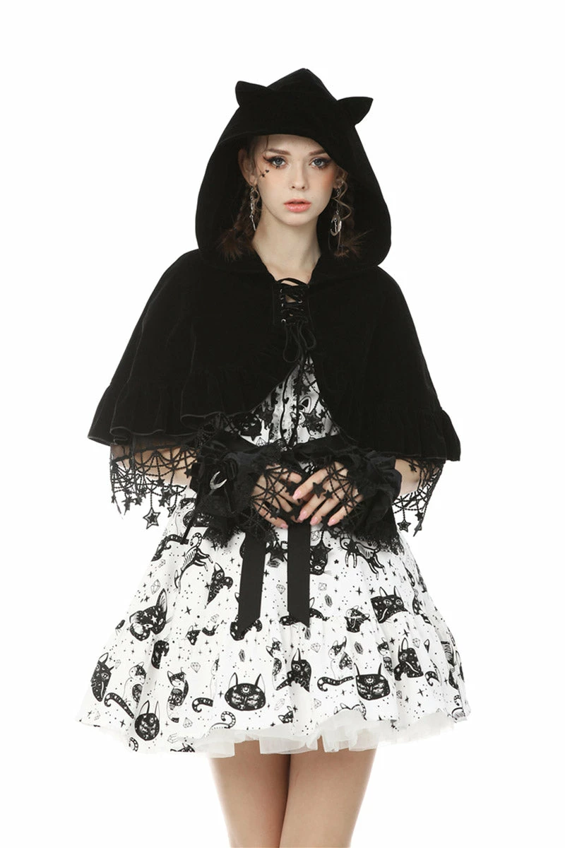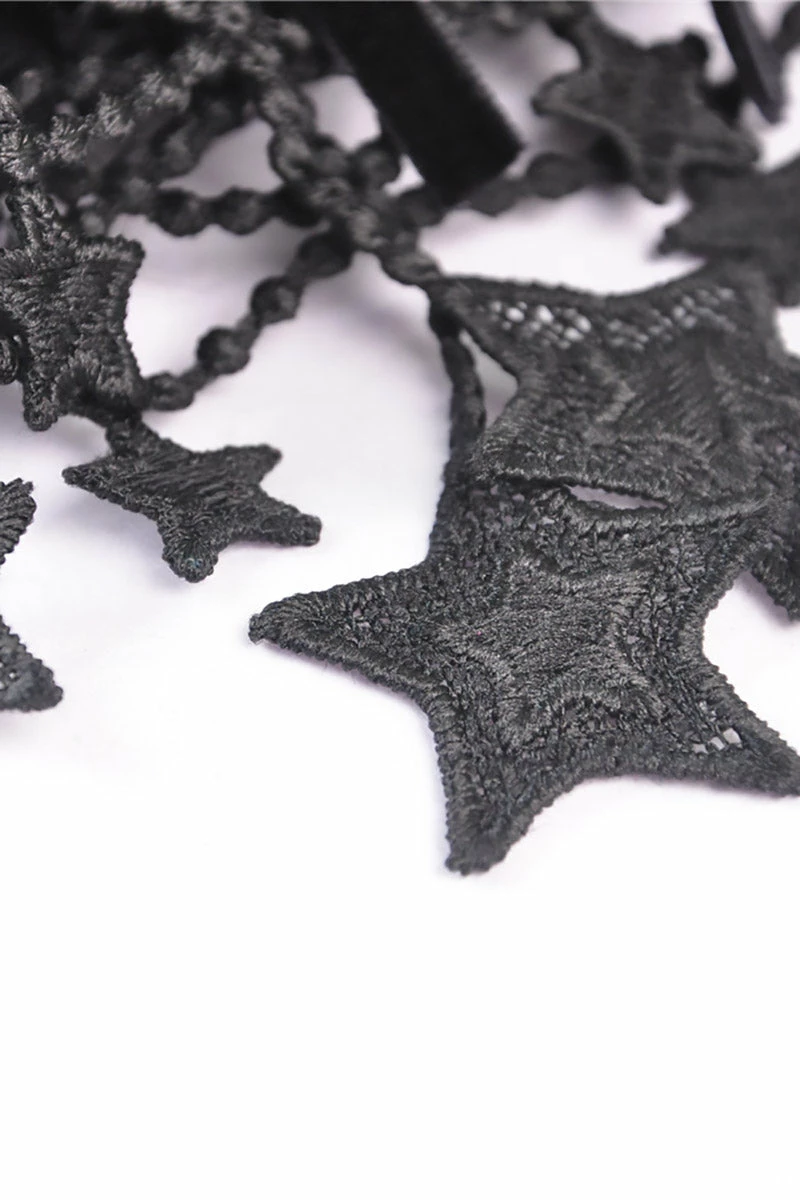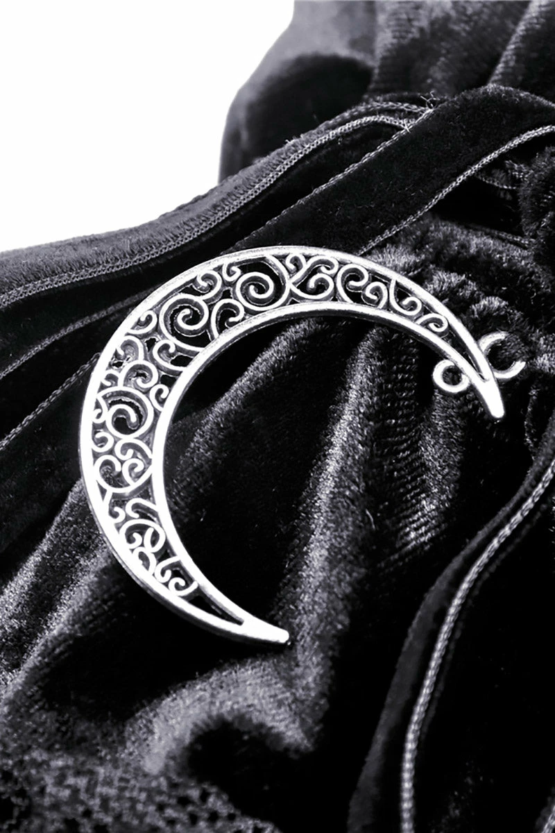 Commune with the moon at tonight’s ritual in these gorgeous goth gloves! Romance the night in the soft velvet design, enchanted with ruffle lace trim, silver moon charms, and embroidered stars dangling from the cuff construct. Finished with adjustable wrist ties for the sinfully perfect fit.Â