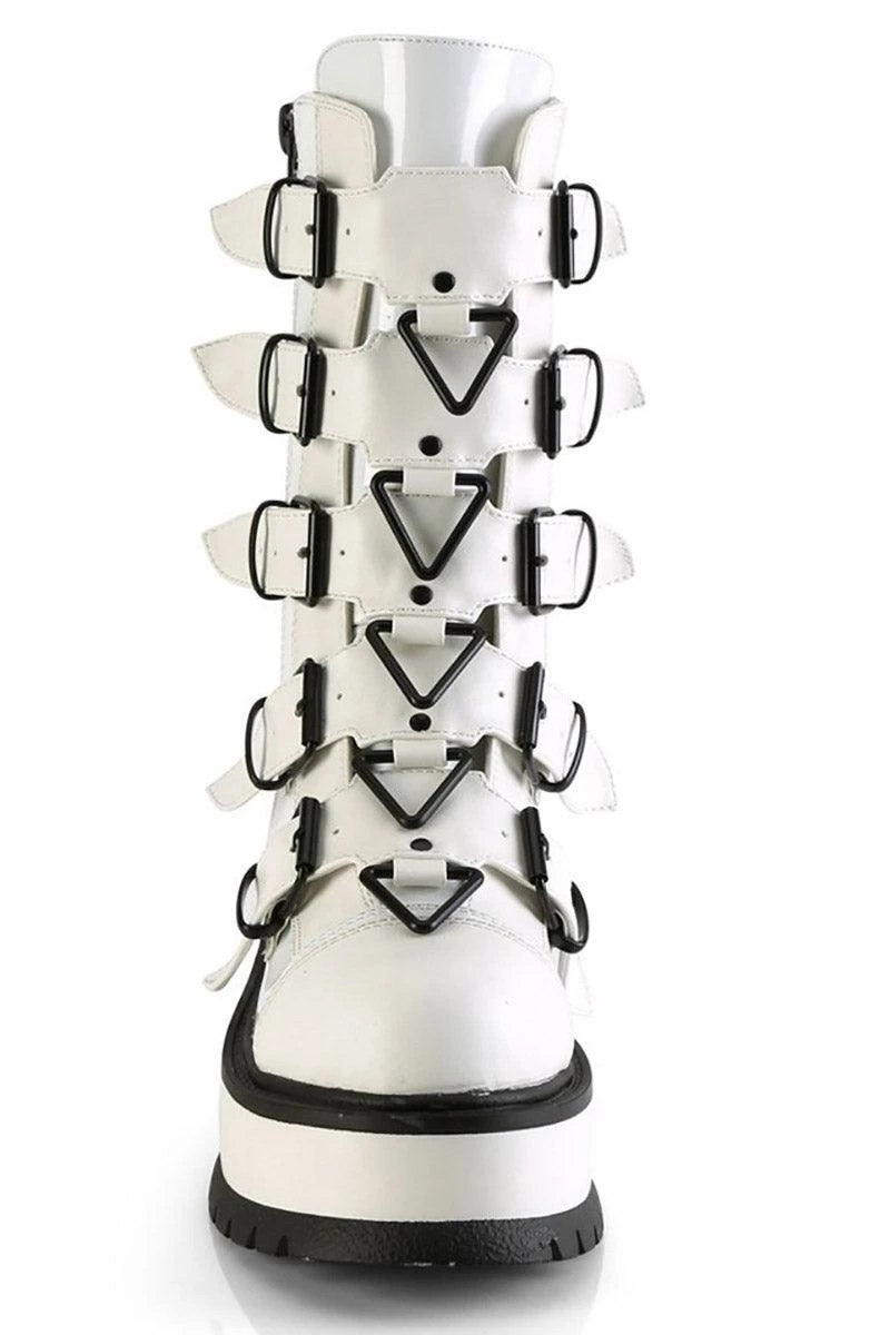 Stomp on the graves of your enemies in these statement Demonia boots—ghostly white so the dead know you’re coming. Iron triangle rings blast down the front… made of black metal to please your black heart. Rise above the ashes in the 2″ platform, finished with adjustable buckle straps, lace-up details, and mid-calf cut.