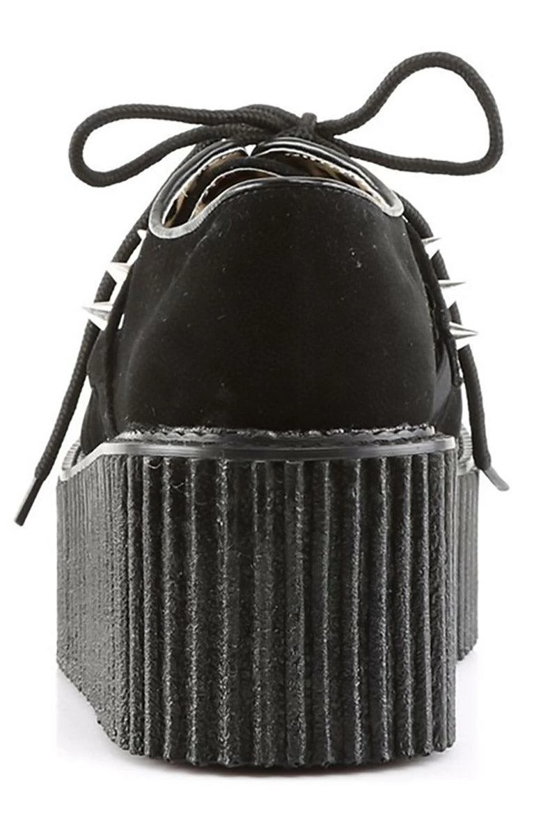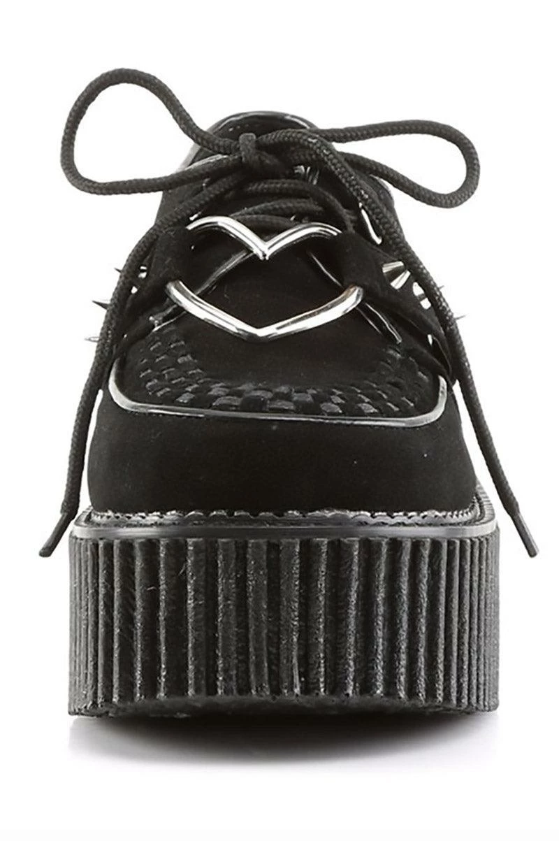 Summon sweet spooks to your style with these cute creepers! Haunt the shadows in the black suede construction, romanced with a metal heart o-ring and silver rivet spikes. Finished with interwoven apron details, accent straps, and a statement lace-up design.Â