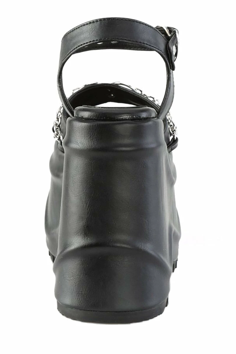 Follow your dark heart wearing these darling Demonia mary janes, haunted with a wicked 6″ platform! Made of black vegan leather, these gothic wedges feature silver heart ring hardware and metal chain detailing. Adjust the buckled ankle strap for the perfect punk fit. Pair these street goth platforms with a maxi skirt and oversized sweater for winter witch feels.