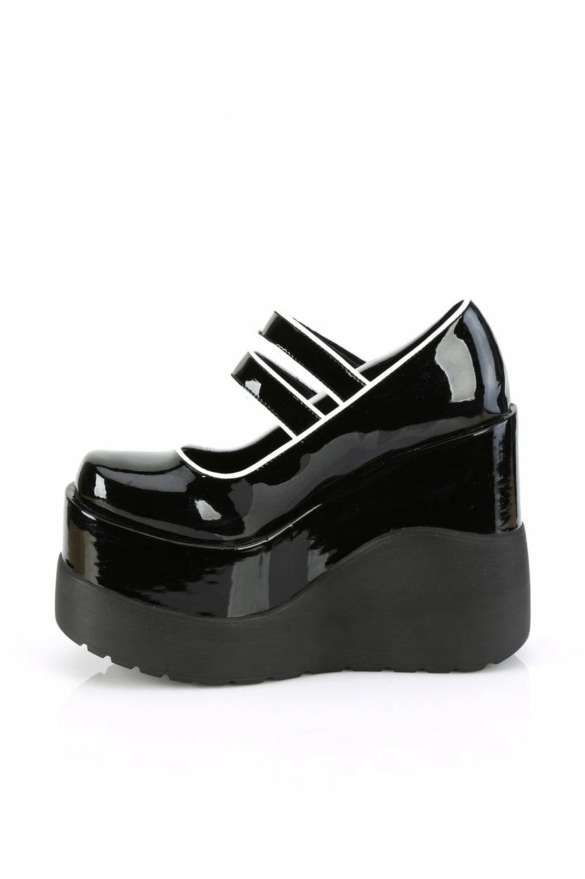 Get legs for days in these hella high mary janes! Made of vegan patent leather, these shiny black wedges feature a statement 5 inch platform. Bone-white contrast piping haunts the shiny black design. Complete with matching buttons and double straps for extra dark drama.Â