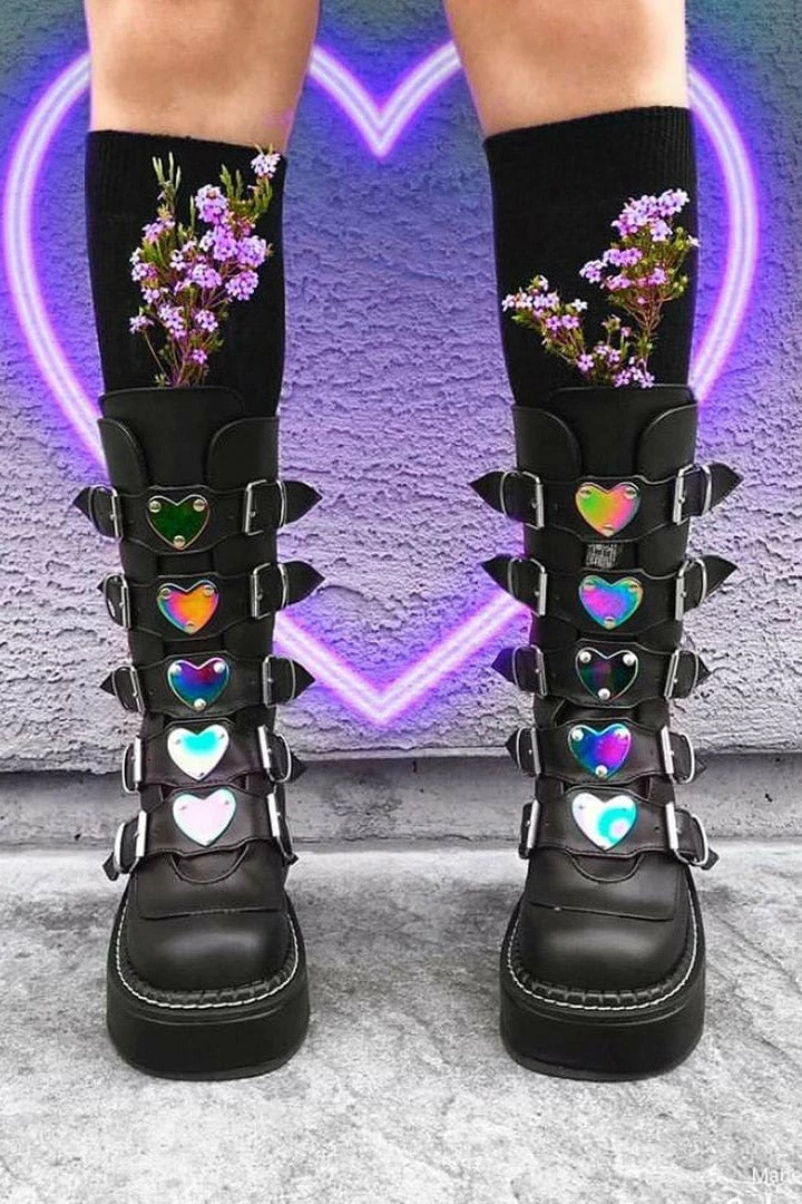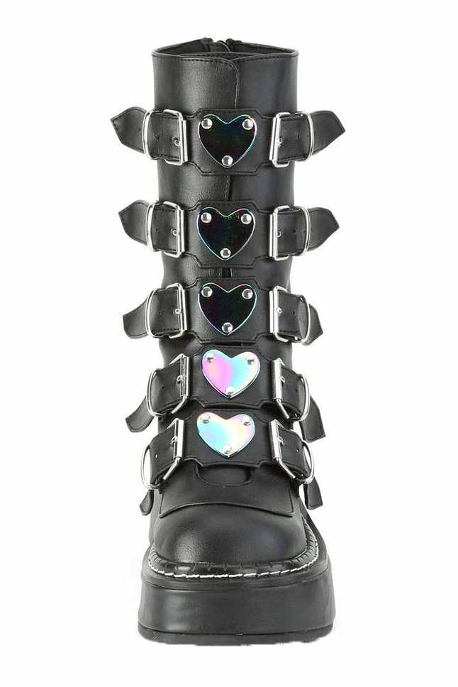 Follow your heart in these darling buckle boots! These pretty platforms feature 5 adjustable buckle straps romanced with colorful plated hearts down the middle. Make their heart skip a beat in the 2″ platform, mid-calf design, and quality black vegan leather. Perfect for pairing with your fav mini skirt or dress!Â