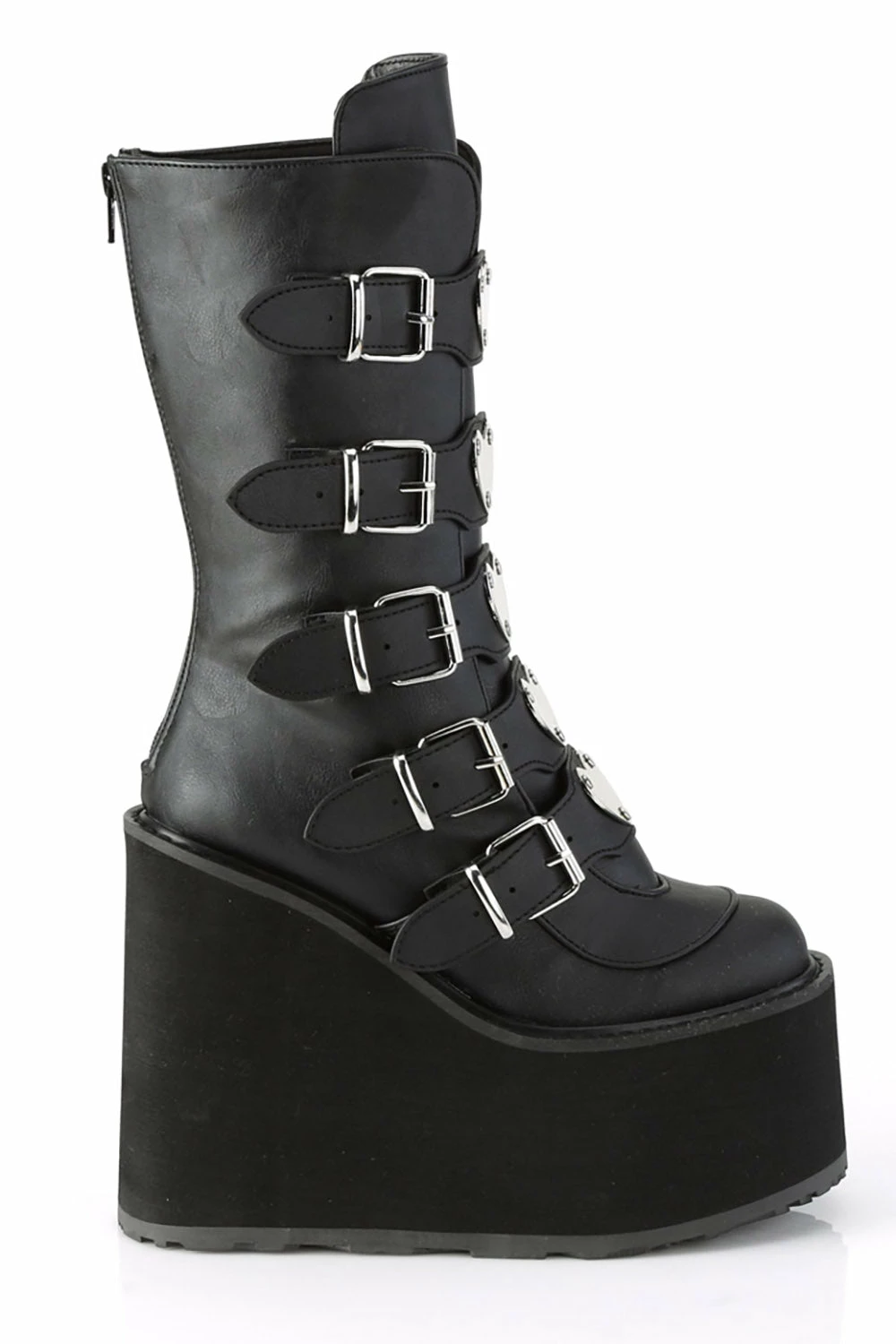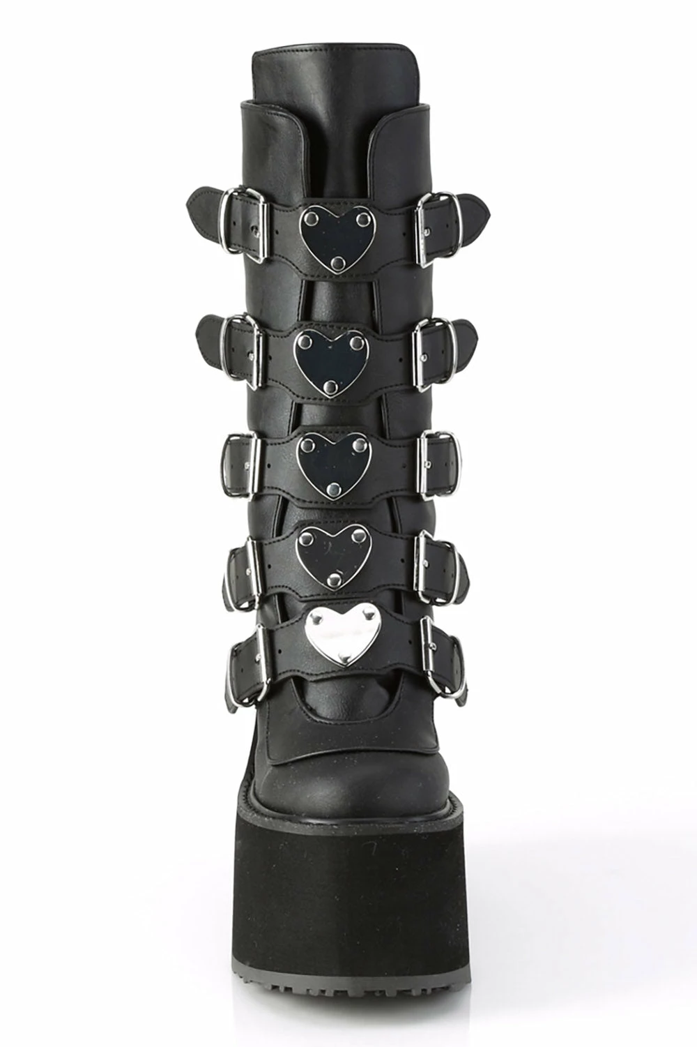 Add some kills to your heartbreak hit list in these romantic goth boots! Heart-shaped metal plates enchant the front of the shoe—silver buckles possess the sides. Made of quality vegan leather, these mid-calf boots feature a black metal zip closure for the sinfully perfect fit. Finished with a 5.5″ platform to give your badness a helluva boost!