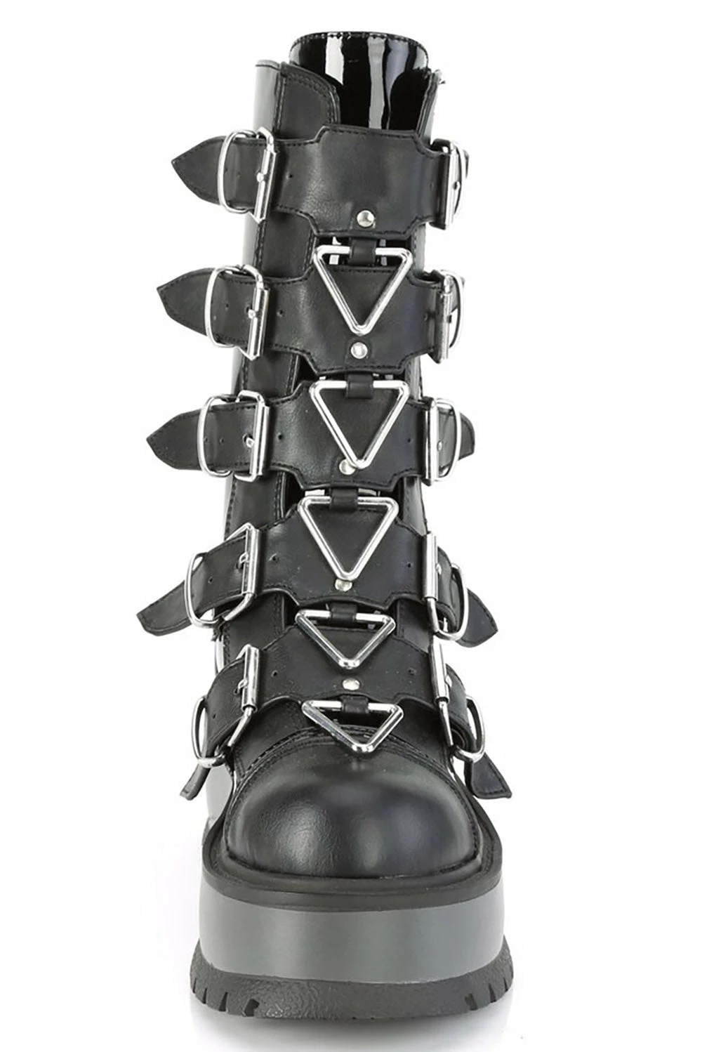 Invoke your inner evil in these dark Demonia boots, hexed with inverse metal triangles blasting up the front. Constructed of quality vegan leather, these statement buckle boots feature adjustable accent straps, a chunky split-color platform, and silver side zip closure. Finished with shiny PU black detailing to shine in the night. Â