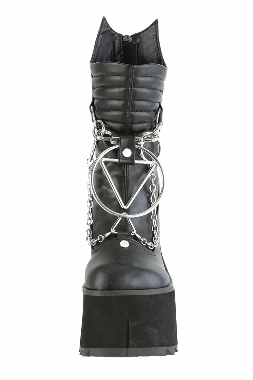 Hex the moon in these bewitching boots, punked and pierced with metal hardware! Harness the chaos within you in the screw studs, O-ring, T-ring, and D-ring detailing. Silver chains dangle from the oversized statement hardware. Stomp the night away in the calf-high construct, quilted accents, and winged vegan leather design. Finished with a discrete back zip closure for easy removal. Â