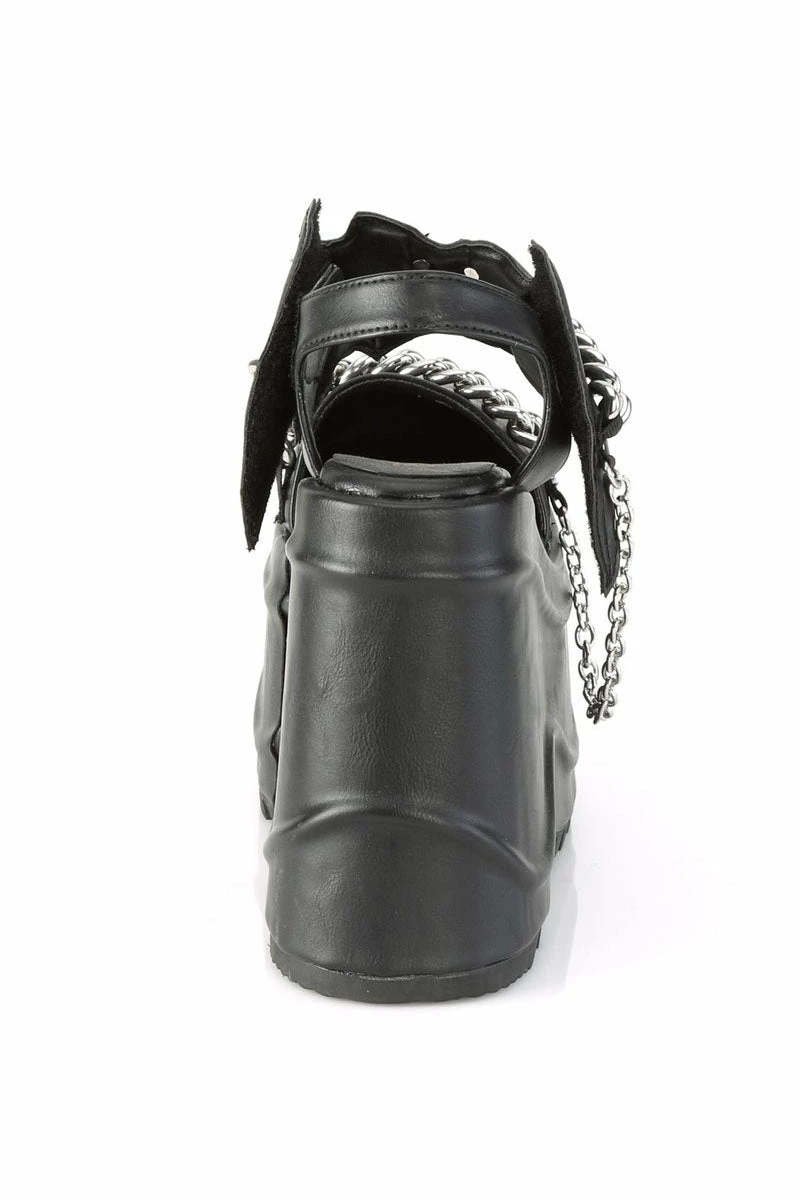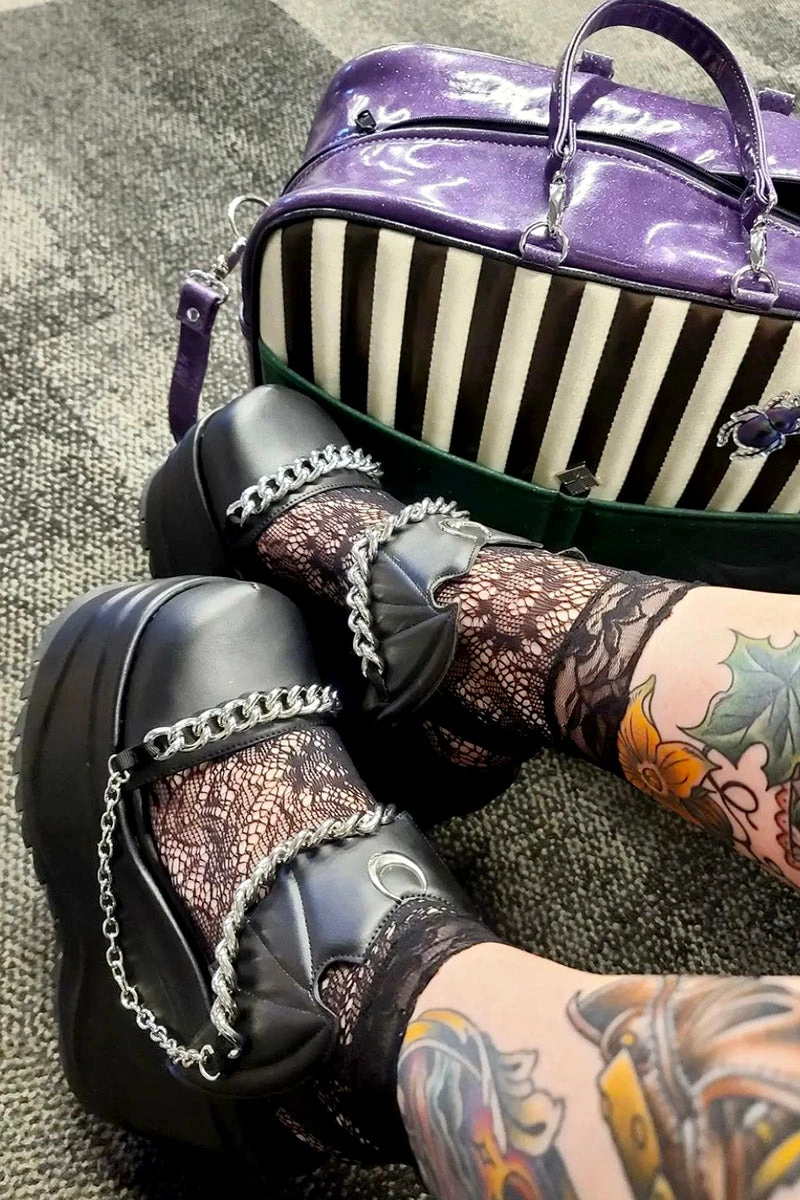 Take flight in these batty mary jane platform sandals! A silver crescent moon charms the wicked bat wing detail, perfect for communing with the blood moon. Statement silver chains enchant the black vegan leather construct. Finished with a spellbinding 6″ heel to lift your dark soul into the night sky!
