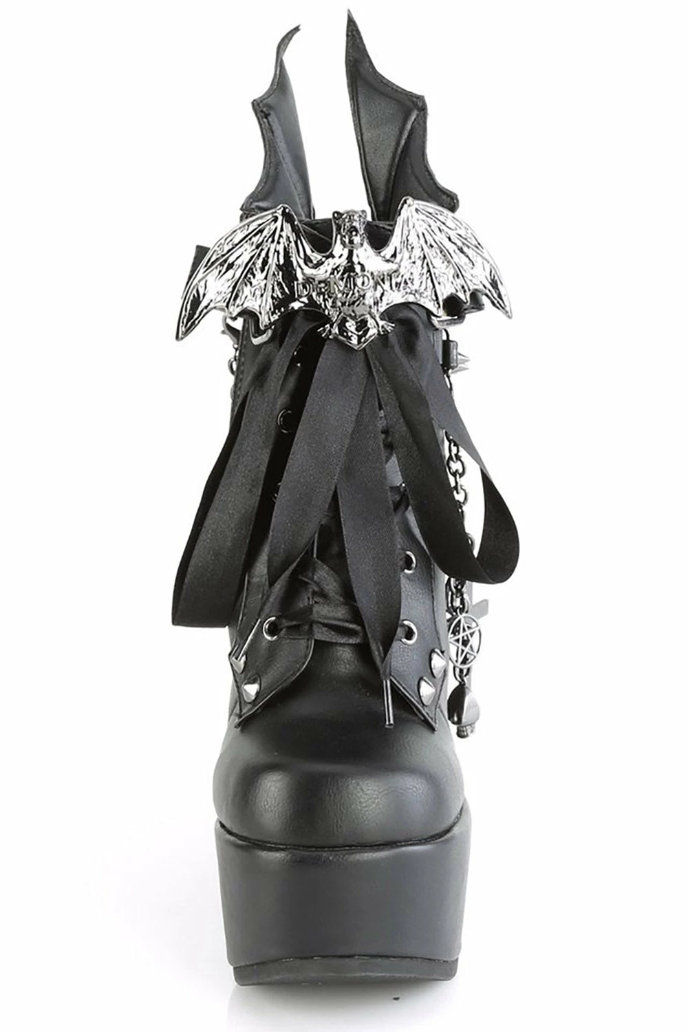 Hex your ex in these bewitching black wedges, haunted with large silver bat ornaments engraved with Demonia detailing. Lace up the romantic ribbon ties, charmed with metal rivet spikes, studs, and adjustable buckle straps. Finished with a statement batwing design on the back, plus a detachable chain complete with gothic charms.