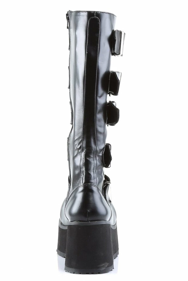 Own the night in these dark Demonia boots, made for monsters and men. Glow under starlight in the black vegan leather construct. Possessed with 5 silver buckles and lace-up details, these knee-high boots are complete with a 3 1/4″ platform to give your badness a boost. Made of quality vegan leather cause creepy cow lives matter!Â