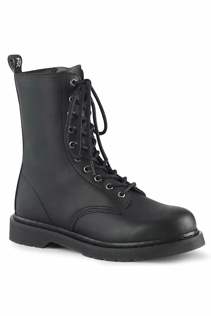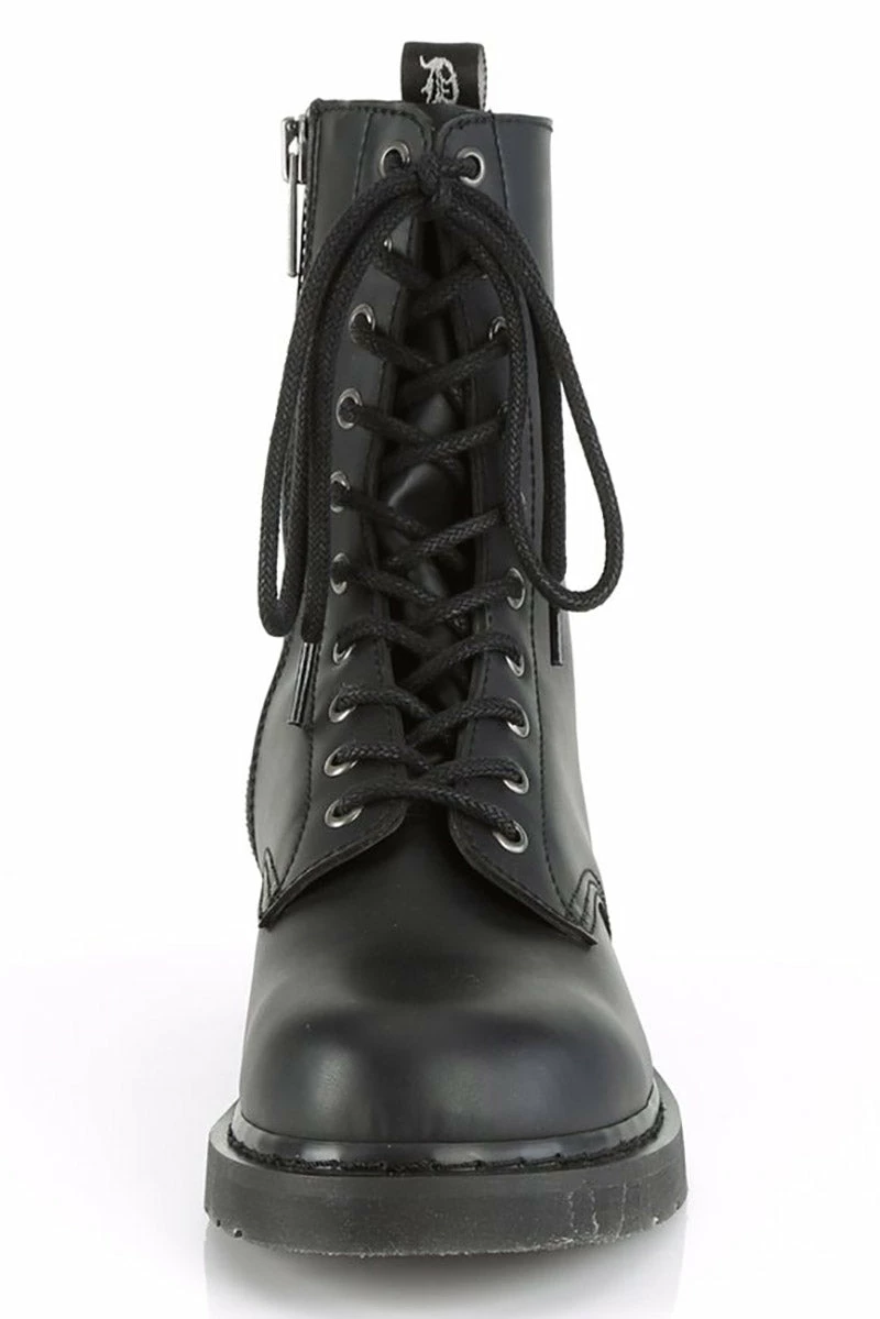 Plunge into the dead of eventide in these dark & deadly Demonia boots. Your chaos is a weapon in the black metal eyelet hardware, stacked flat heel, and back pull tab. Unleash in the mid-calf combat style, inner zip closure with lace-up details, and 1 1/4 inch platform. Constructed of quality black vegan leather cause you’ve done enough killing to last a lifetime.