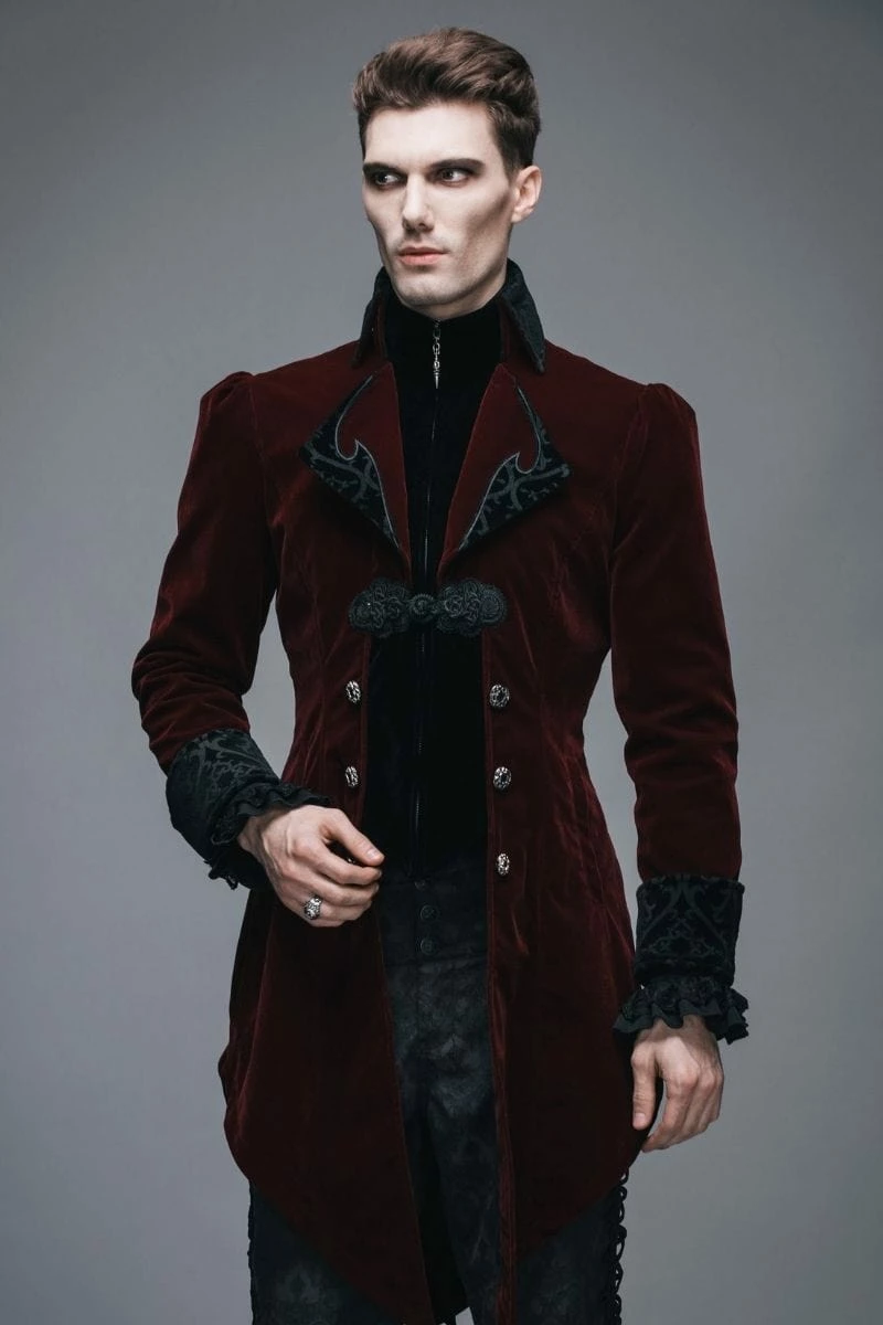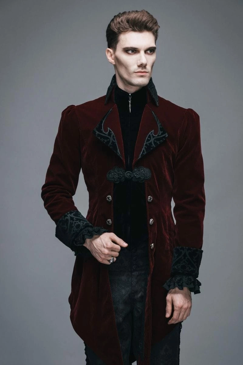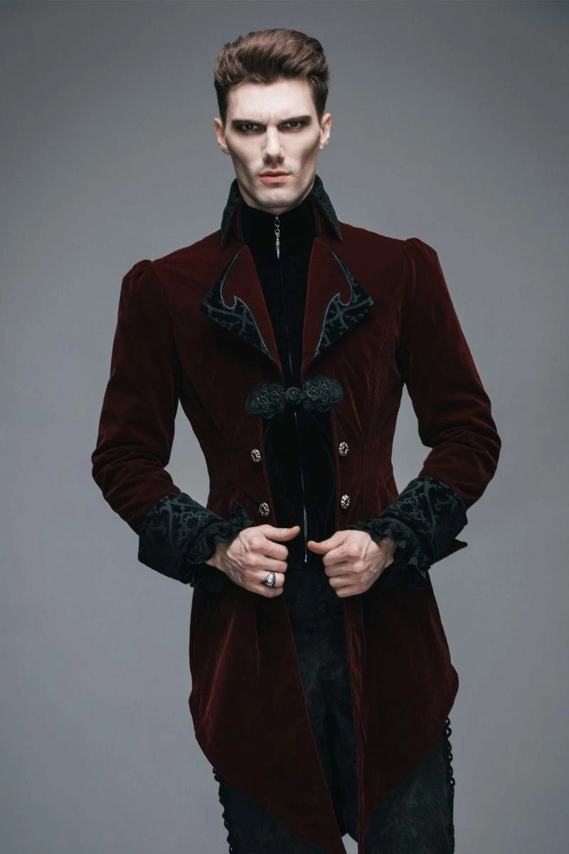 Dark red velvet & black tailored gothic-victorian men’s tail coat jacket – perfect as a grooms jacket, for formals, victorian costume parties and cosplay events.