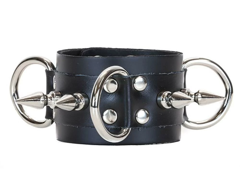 Armor-up in this hella cool bondage bracelet, made for punks who just don’t give a fu*k! Fear knows your name in the legions of hardcore hardware, featuring three large D-rings, metal rivet spikes, and silver circe studs. Constructed of 100% genuine leather and finished with an adjustable buckle closure for the perfect punk fit.Â