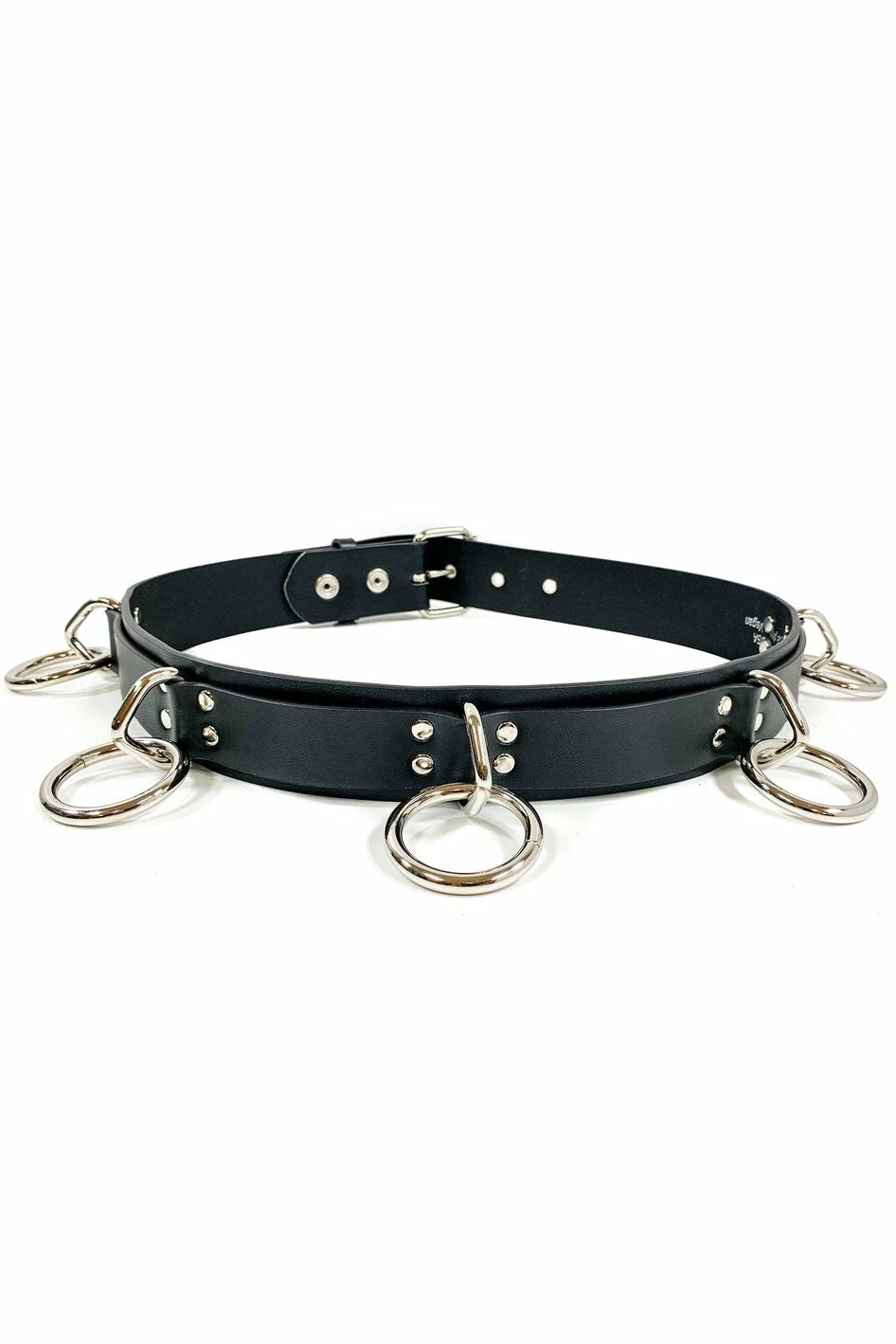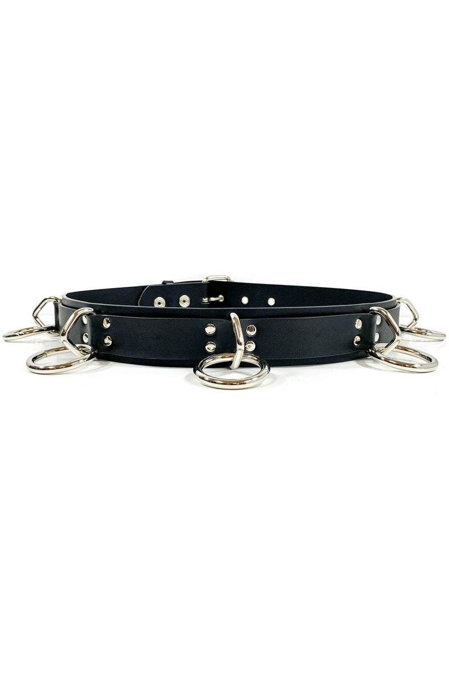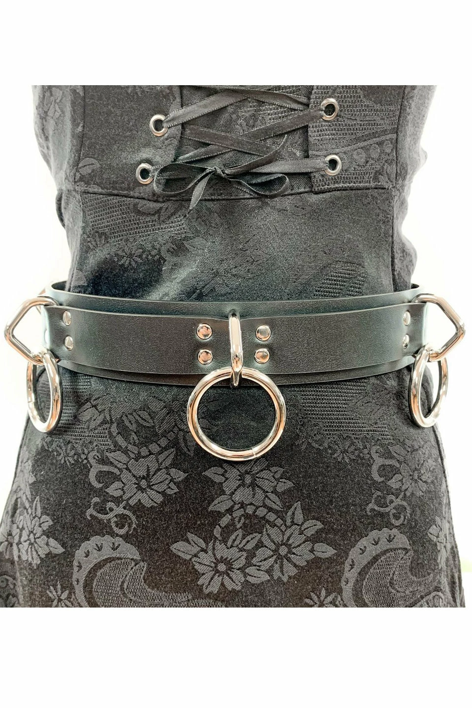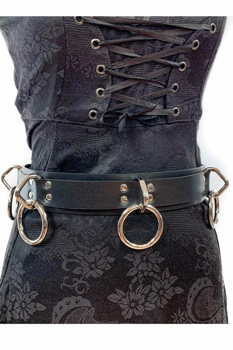 Wrap your waist in bondage with this signature goth belt, haunted with o-ring and d-ring hardware. Add some darkness to your daily rituals with the durable design, metal studs, and silver buckle closure. Vegan leather construction cause creepy cow lives matter!Â