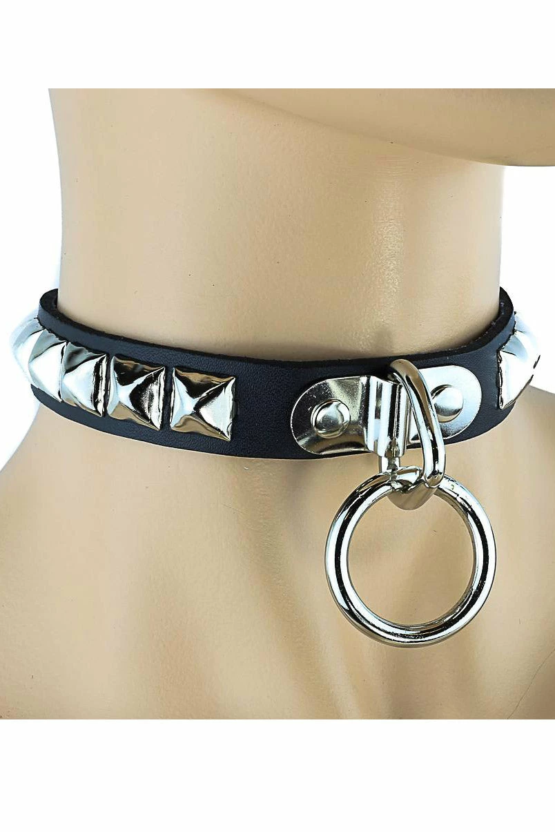 Haunt the night in this studded collar, possessed by punk! Silver pyramid studs on the sides, plus a large center O-ring. Rock your rebellious side in the genuine leather construction, complete with a silver buckle close for the perfect fit.