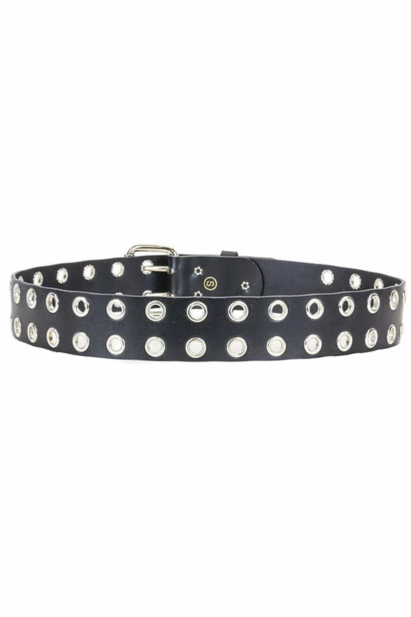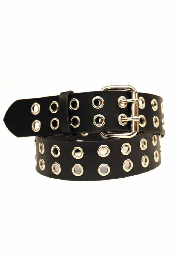 Add some evil to your alt clothes with this statement eyelet belt! Punk-up your style with the genuine leather construction, durable design, and adjustable buckle close. Hexed with 2 rows of metal eyelets, this punk belt is designed to conjure creeps to your goth clothes.