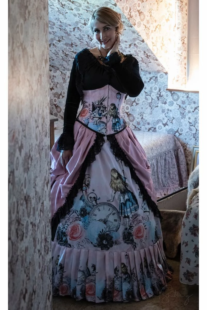 Alice in Wonderland characters come to life on this unique custom sized victorian corset gown / victorian wedding dress which features black trimming and an under bust corset.