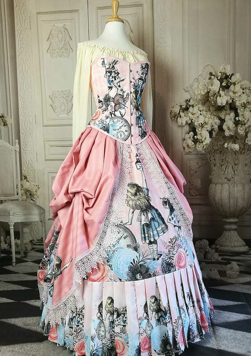Alice in Wonderland characters come to life on this unique custom sized victorian corset gown / victorian wedding dress.