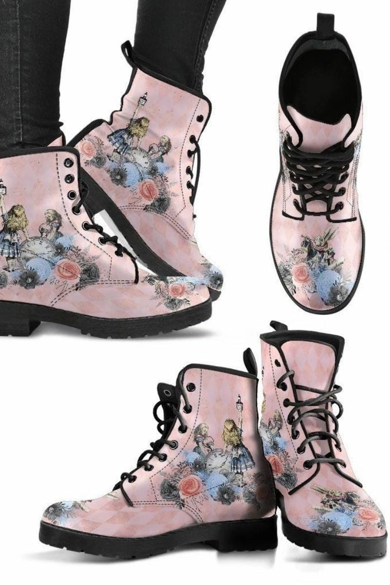 - Alice in Wonderland printed boots with a rounded toe.