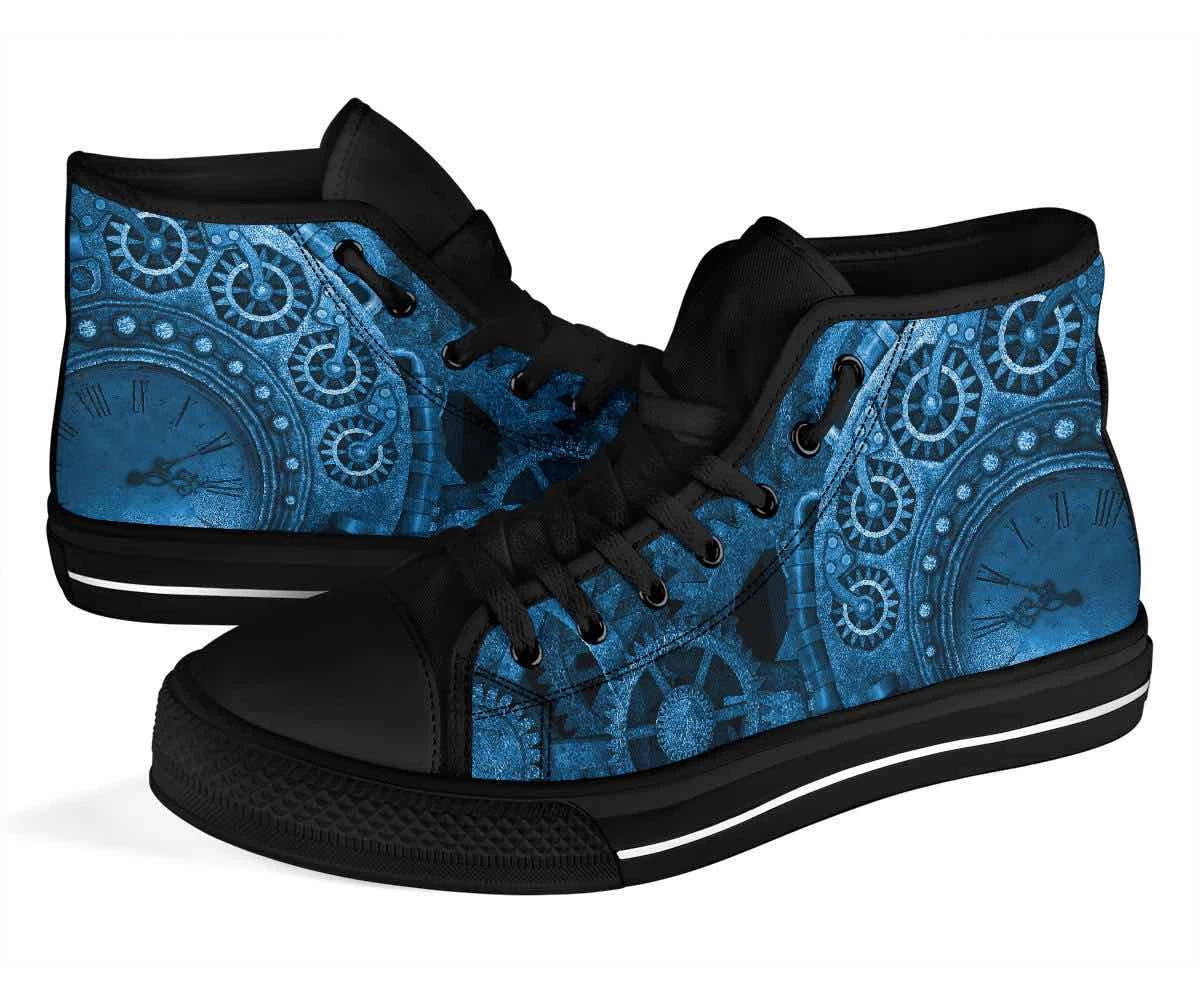 - Full canvas double sided steampunk clockwork gears print on a quality high top sneaker with a rounded toe construction.