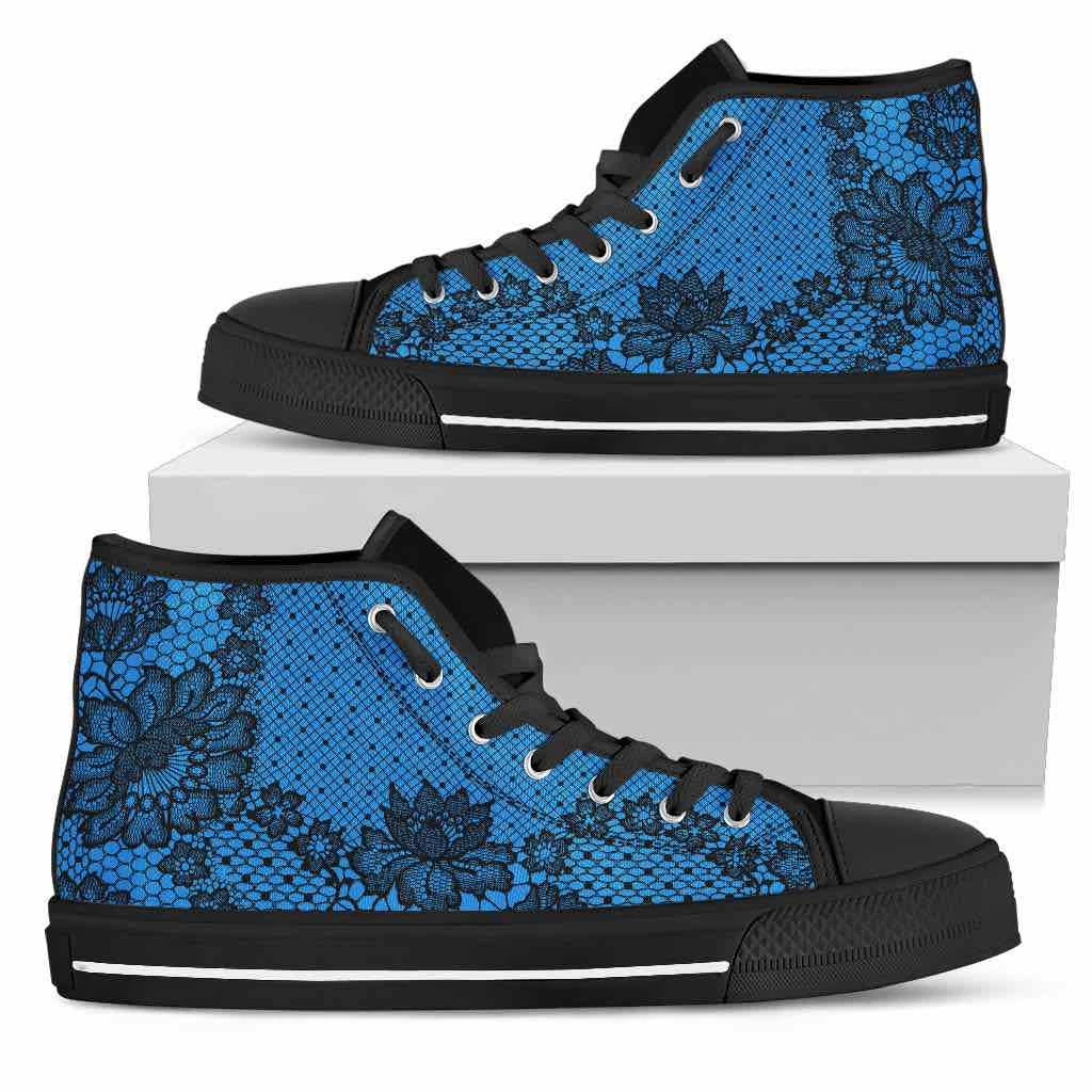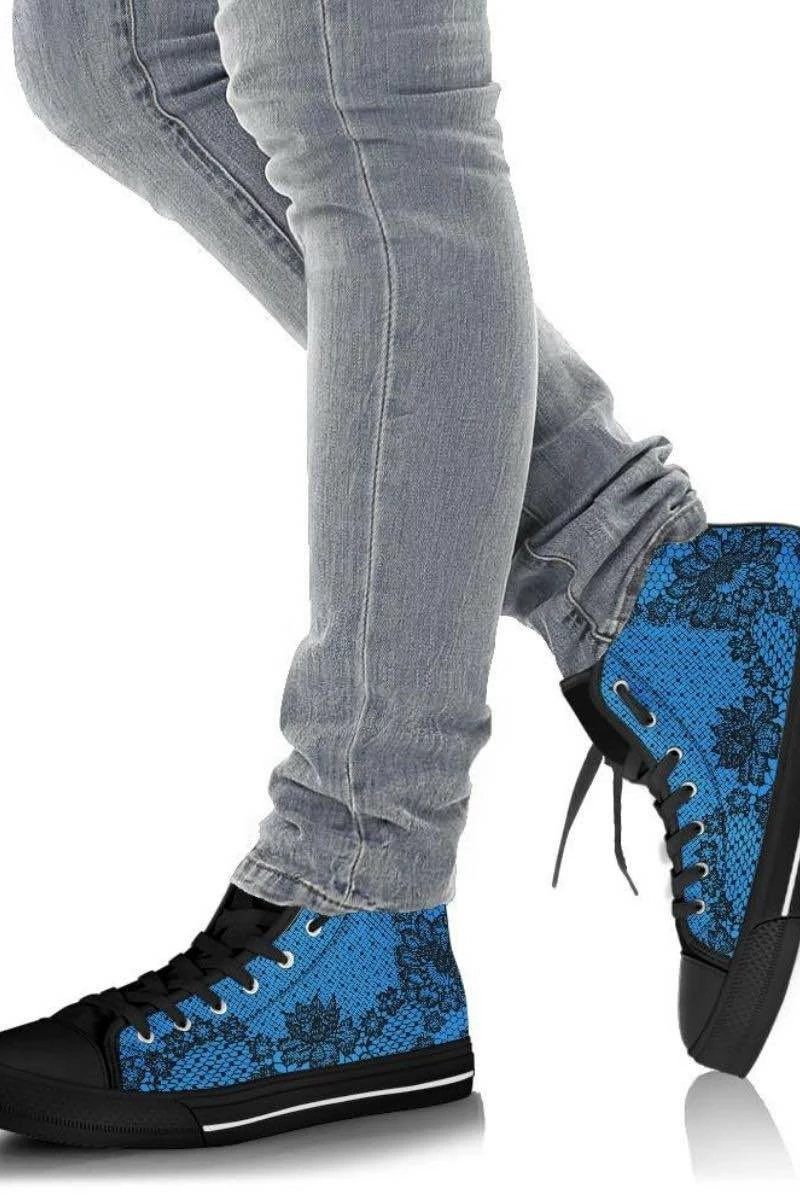 - Full canvas double sided bright blue with black lace overlay print on a quality high top sneaker with a rounded toe construction.