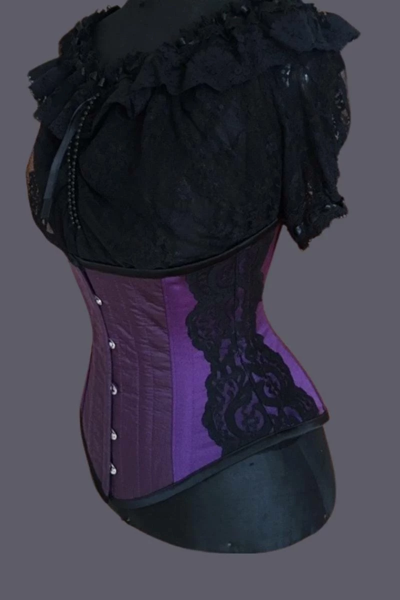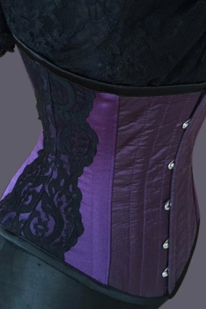 Amethyst silk and purple form a sensual combination offset with delicate black lace appliqué on front and back of this exquisite under bust corset.
