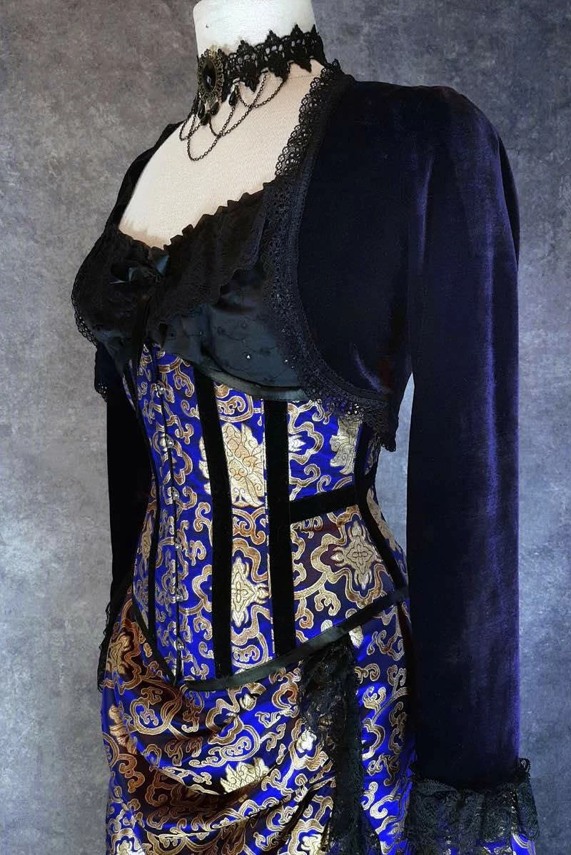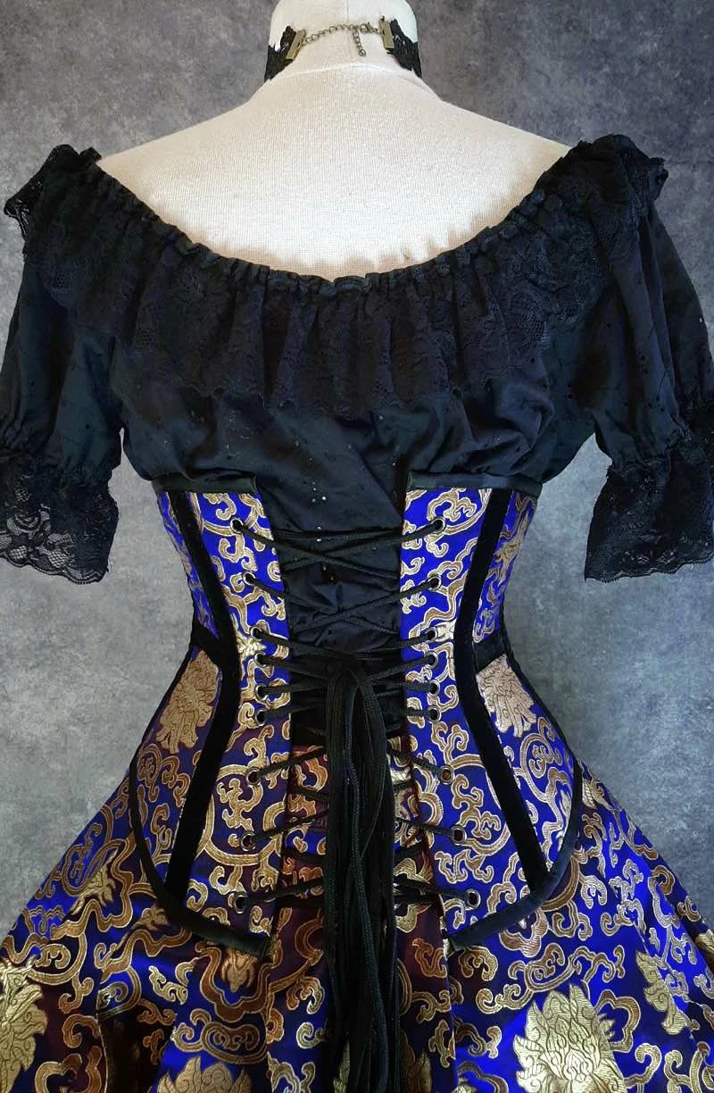 - The Royal Blue Brocade Under Bust corset typically cinches your waist in by 3″ – 5″ depending on your body type. Â